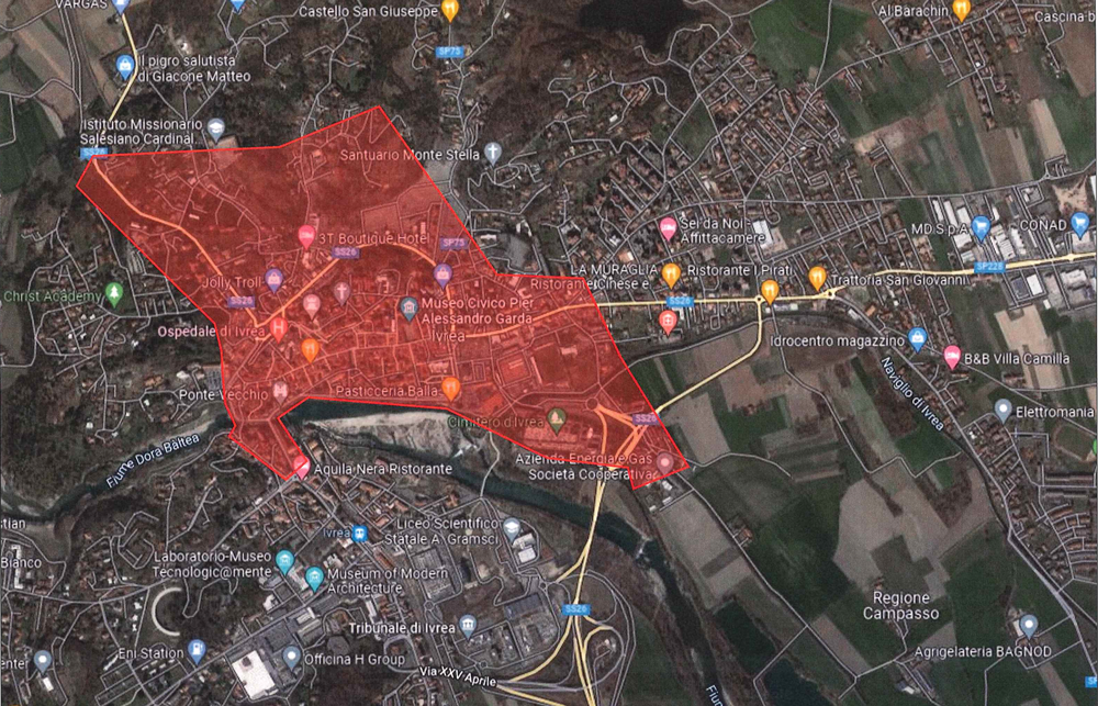A Ivrea da martedì 05 luglio 2022 alle 22 e fino a mercoledì 06 luglio 2022 alle 6 causa lavori improrogabili di sostituzione valvole su condotta di distribuzione acquedotto, verrà interrotta/ridotta temporaneamente, l’erogazione dell’acqua in una vasta zona della città come mostrato nella planimetria sotto.
