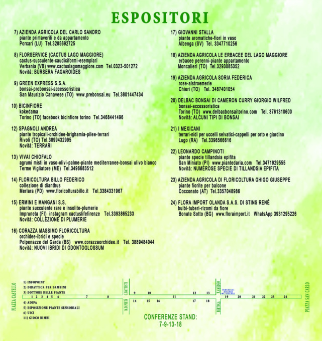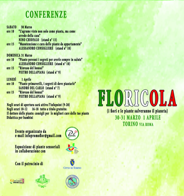 Dal dottore delle piante, alla didattica dei bambini, conferenze a tema dei produttori, piante sensoriali, in collaborazione con U.I.C.I. e A.di.P.A. con ingresso gratuito FLORICOLA è diventata ormai un punto fermo per gli appassionati del verde della città di Torino e di tutta la Regione.