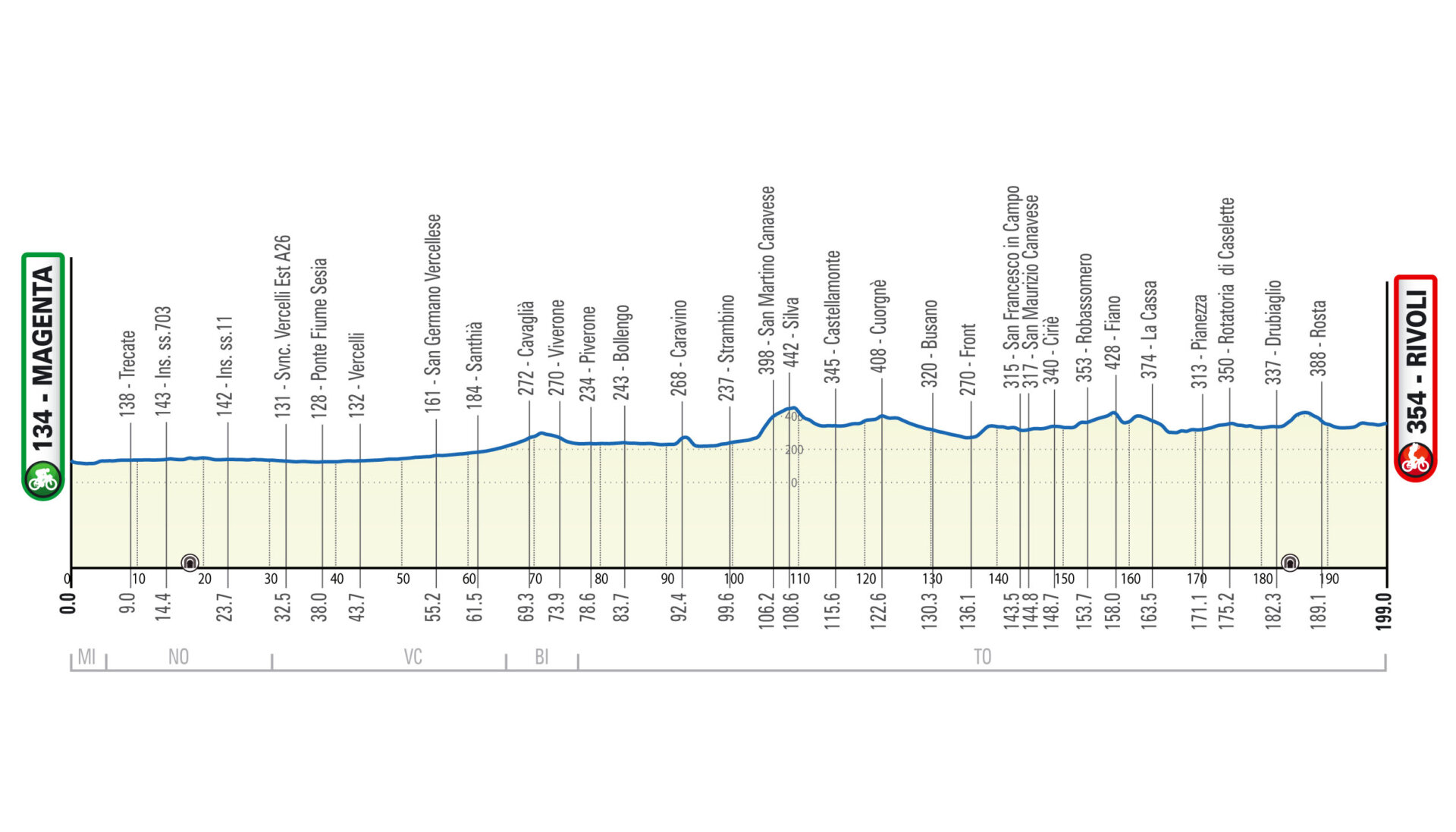 Il percorso è sostanzialmente pianeggiante fatto salvo l’attraversamento del Canavese dove sono proposti alcuni brevi saliscendi che non presentano né lunghezze né pendenze degne di rilievo. Partenza da Magenta per attraversare su strade pianeggianti l’alta pianura padana nella zona delle risaie toccando Novara e Vercelli per portarsi quindi nel Canavese dopo Cavaglià, Viverone e Bollengo. Il Canavese si presenta con piccoli saliscendi che proseguono e Nord di Torino nella zona del Parco della Mandria. All’imbocco della Val di Susa la strada torna sostanzialmente pianeggiante fino all’arrivo. Si incontrano, negli abitati attraversati, i consueti ostacoli cittadini come rotatorie, spartitraffico e passaggi rialzati.
