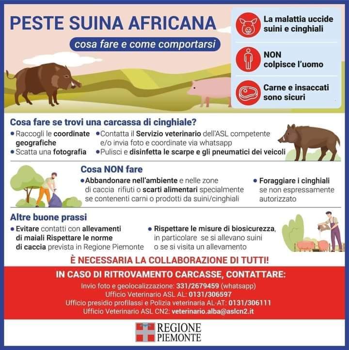 La Peste suina africana ha già provocato la morte di decine di cinghiali e imposto rigide misure di sorveglianza, controlli e divieti di attività all’aperto in un’area che comprende 114 Comuni, di cui 78 in Provincia di Alessandria e 36 nella Città Metropolitana di Genova e in Provincia di Savona. Negli altri territori piemontesi e liguri si impongono misure di sorveglianza e prudenza, come appunto lo stop al ricovero di suidi presso il CANC.