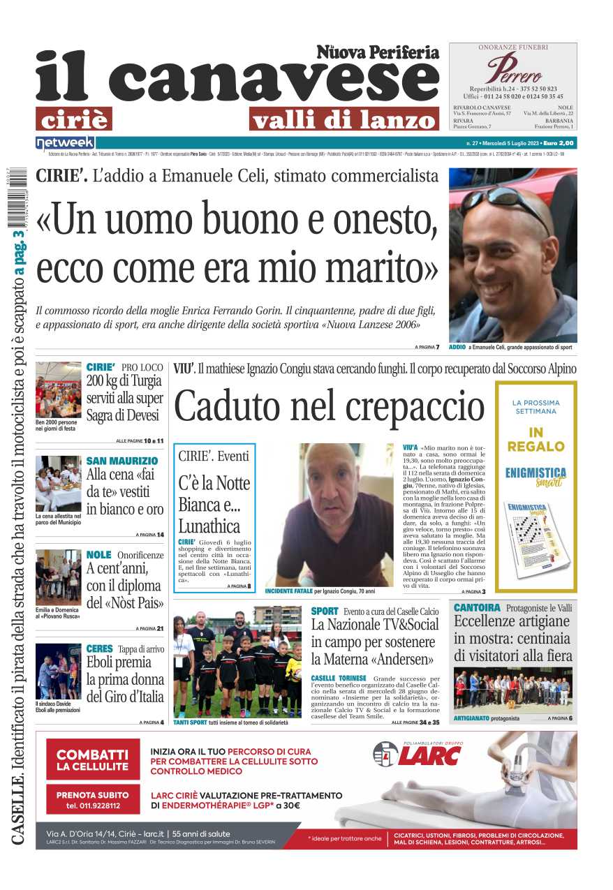 In prima pagina l’addio a Emanuele Celi, stimato commercialista, aveva 50 anni ed era padre di due figli. Lutto anche a Mathi per la scomparsa di Ignazio Congiu, caduto in un crepaccio mentre cercava funghi nei boschi di Viù. A Ciriè c’è grande attesa per la Notte bianca e Lunathica.