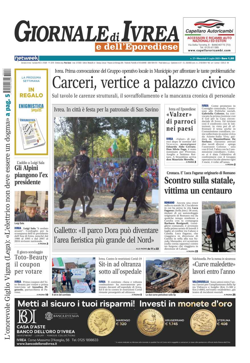 In evidenza il vertice in programma a Palazzo civico sul tema delle carceri: sul tavolo le carenze strutturali, il sovraffollamento e la mancanza cronica di personale. Romano piange Luca Fagaraz deceduto in sella alla sua moto in un tragico incidente sulla statale. A Ivrea la città è in festa per la patronale di San Savino.