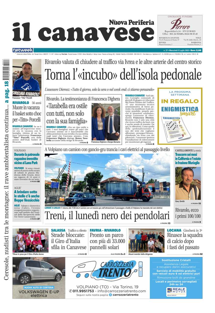 Da domani, mercoledì 05 luglio 2023 il Canavese – edizione Rivarolo, Il Canavese – edizione Ciriè e Valli di Lanzo e Il Giornale di Ivrea sono in edicola. Ecco le prime pagine e le notizie principali.