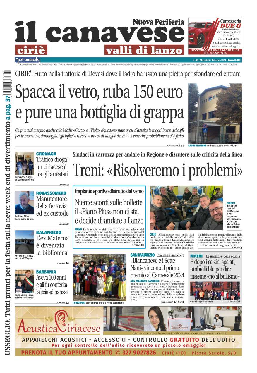 In prima pagina il furto alla trattoriaDevesi di Ciriè, il ladro ha spaccato il vetro e rubato 150 euro e una bottiglia di grappa. Ferrovia Torino-Ceres: l’assessore regionale ai trasporti Marco Gabusi ha incontrato venerdì 2 febbraio al Grattacielo Piemonte di Torino alcuni sindaci del territorio per fare il punto della situazione rispetto alle prime settimane di attività della linea. Traffico di droga smantellato dalla Finanza, nei guai anche un ciriacese.