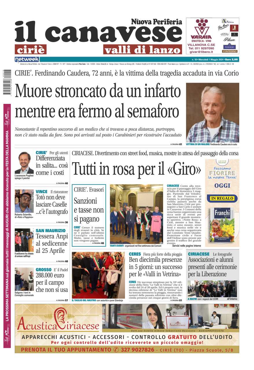 In prima pagina la morte di Ferdinando Caudera, 72 anni, vittima di un malore improvviso e fatale mentre era fermo al semaforo di via Corio a Ciriè. A Ciriè c’è grande attesa per il Giro d’Italia, la notte rosa celebrerà il passaggio della corsa fra balli, musica e street food. A Ceres Velli in vetrina è un successo: 10mila presenze in cinque giorni.