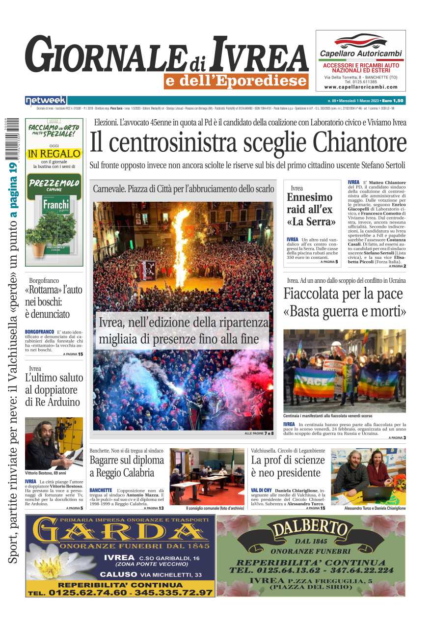 In evidenza le primarie del centrosinistra per decretare il candidato sindaco a Ivrea per le prossime amministrative di maggio: vince Matteo Chiantore, avvocato 45enne in quota al PD. Carnevale, finita la festa è tempo di bilanci e l’edizione della ripartenza fa registrare numeri da capogiro. A Ivrea fiaccolata per la pace: “Basta guerra e morti”.