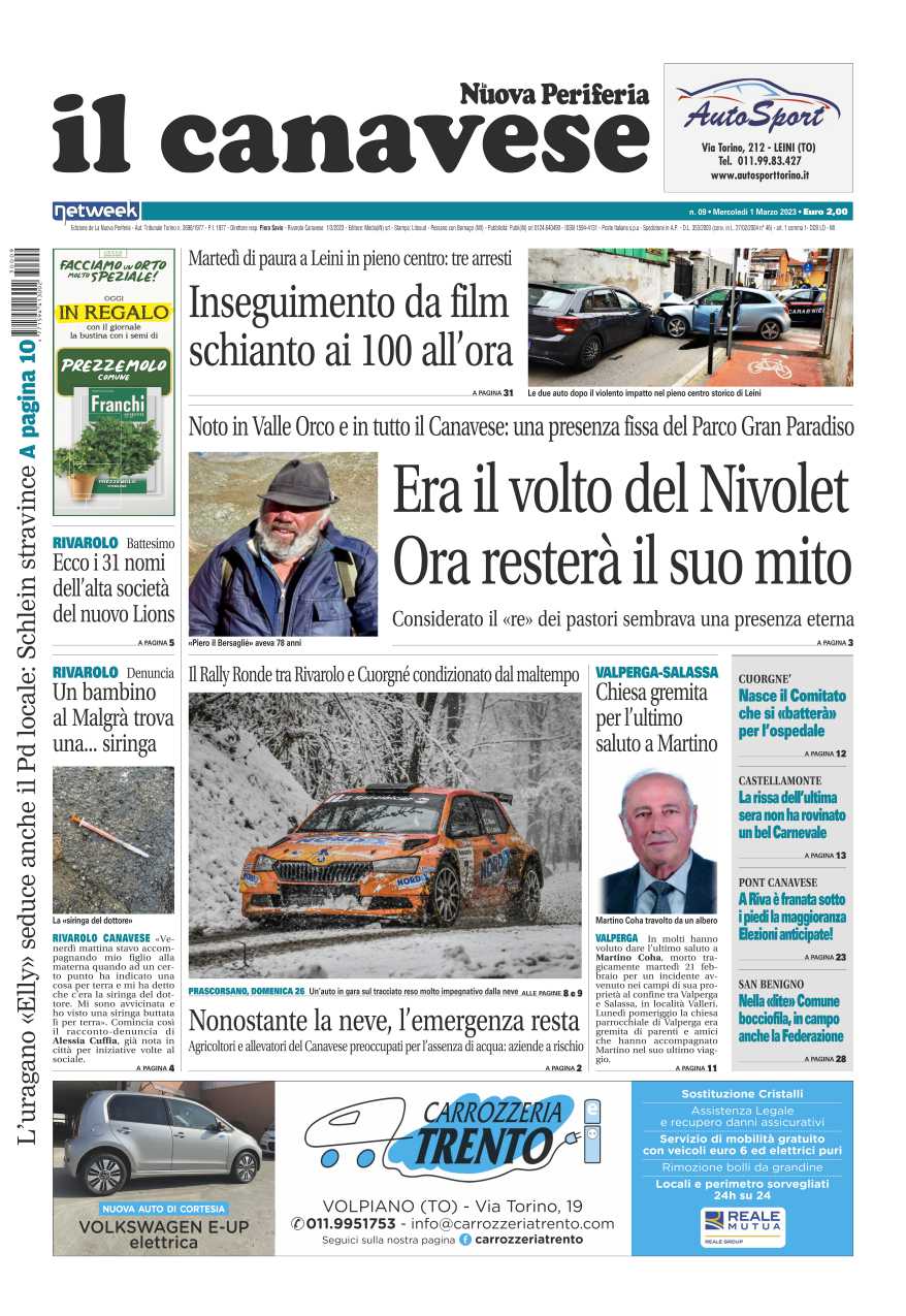 In questa edizione in primo piano la grave emergenza idrica che colpisce anche il nostro territorio nonostante le piogge e le nevicate delle ultime ore: aziende agricole a rischio. L’inseguimento da film fra le vie del centro di Leini, alla fine i malviventi in fuga si schiantano contro un’auto di passaggio e vengono fermati. Lutto in Valle Soana, la montagna piange «Piero il Bersaglié».