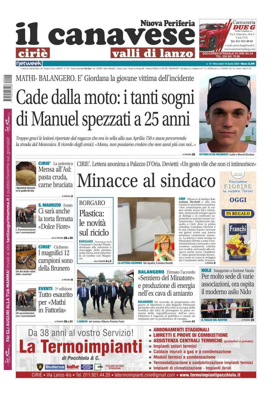In prima pagina il terribile incidente in moto che ha spezzato per sempre la vita di Manuel Giordana a soli 25 anni. A Ciriè la lettera ricevuta da sindaco e amministratori contenente minacce: «Un gesto vile». A Balangero incontro con il Ministro Pichetto Fratin per la bonifica della cava di amianto.
