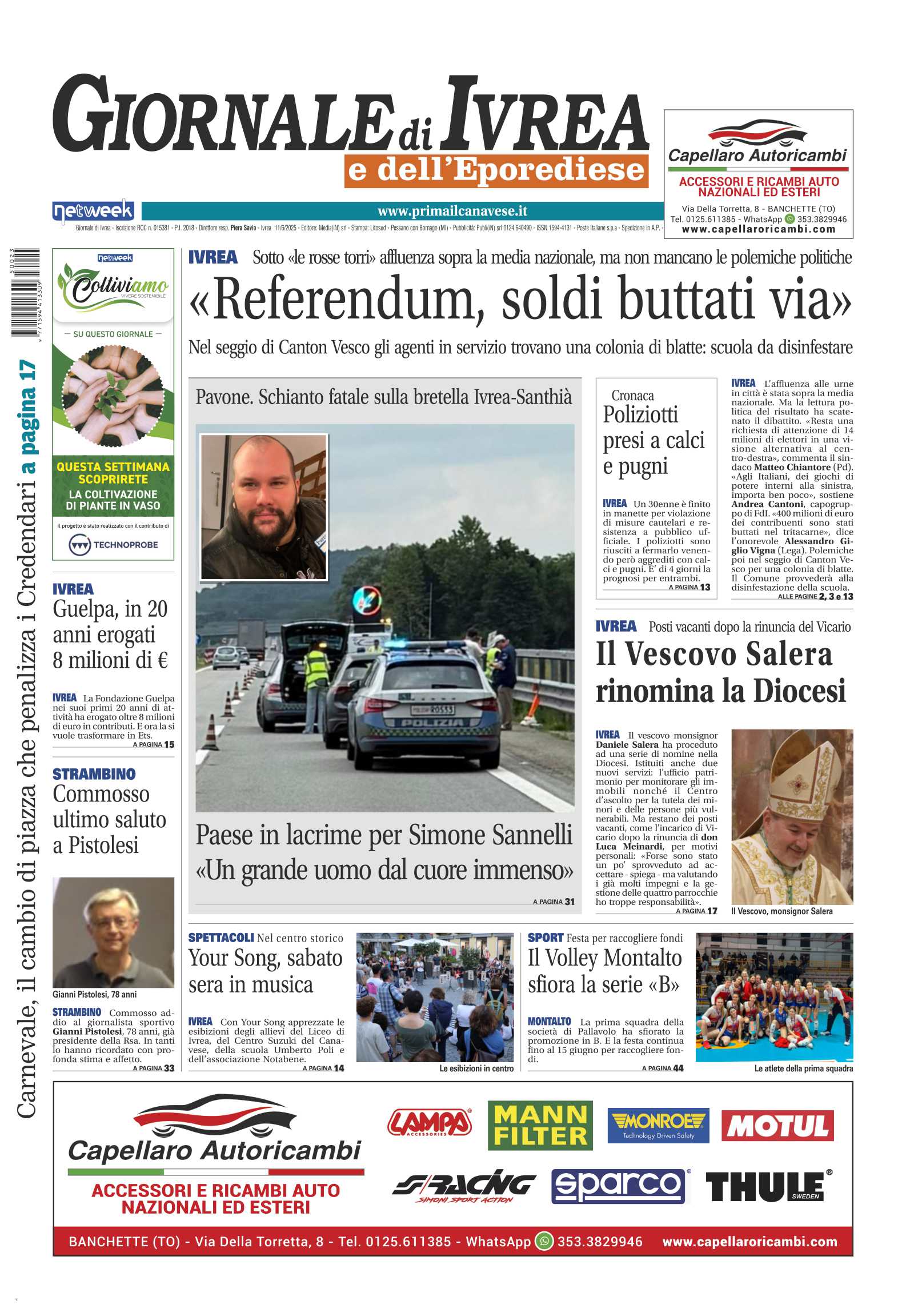 In evidenza la polemica sotto le Rosse Torri sul referendum: «Soldi buttati via», anche se in città votanti sopra la media nazionale. Pavone in lacrime per l’improvvisa scomparsa di Simone Sannelli, vittima di un terribile schianto sulla bretella Ivrea-Santhià. A Ivrea poliziotti presi a calci e pugni.