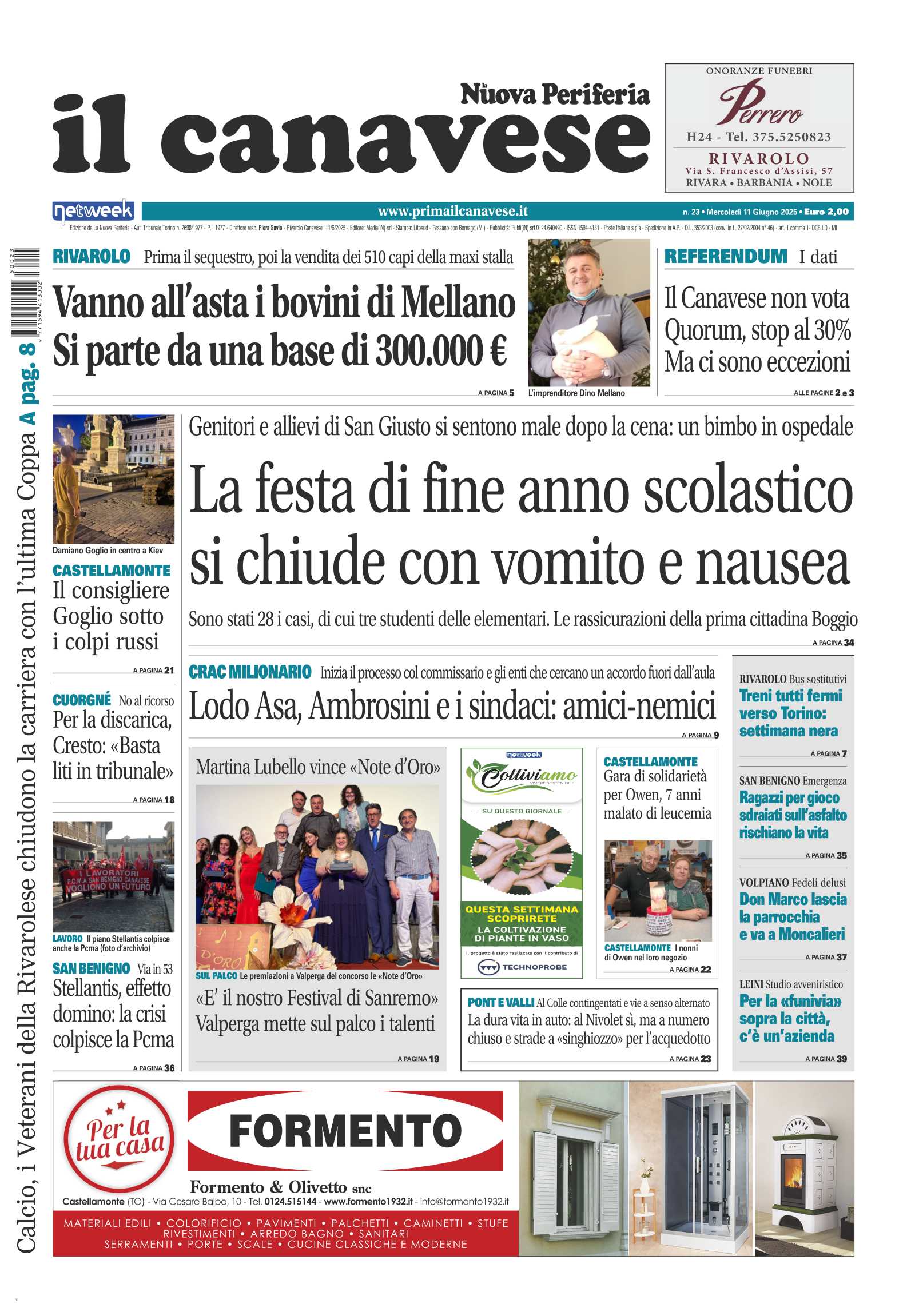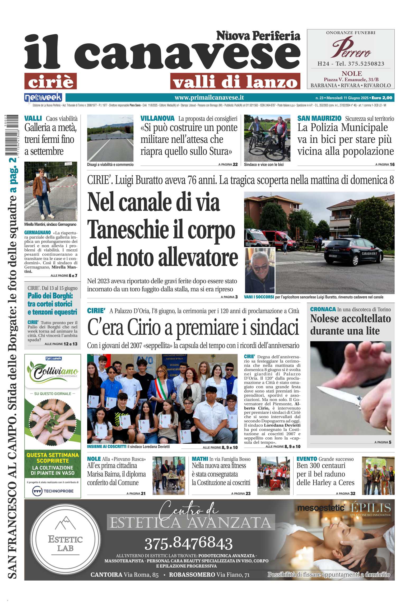 In prima pagina la tragica scomparsa di Luigi Buratto, ritrovato cadavere in un canale in via Taneschie a Ciriè, nel 2023 il noto allevatore era stato incornato da un toro riportando gravi ferite dalle quali però si era ripreso. Nolese accoltellato durante una lite in una discoteca a Torino. A Palazzo D’Oria a Ciriè la cerimonia per i 120 anni della Città, a premiare i sindaci il presidente della Regione Piemonte Alberto Cirio.