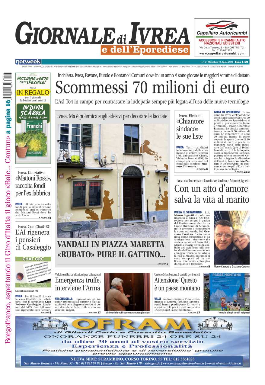 In evidenza l’inchiesta sulle scommesse: nell’Eporediese giocati 70 milioni di euro, Ivrea, Pavone, Burolo e Romano sono i paesi dove si scommette di più. Vandali in piazza Maretta: rubato pure il gattino. La storia di Graziana che con un gesto d’amore ha salvato la vita al marito.