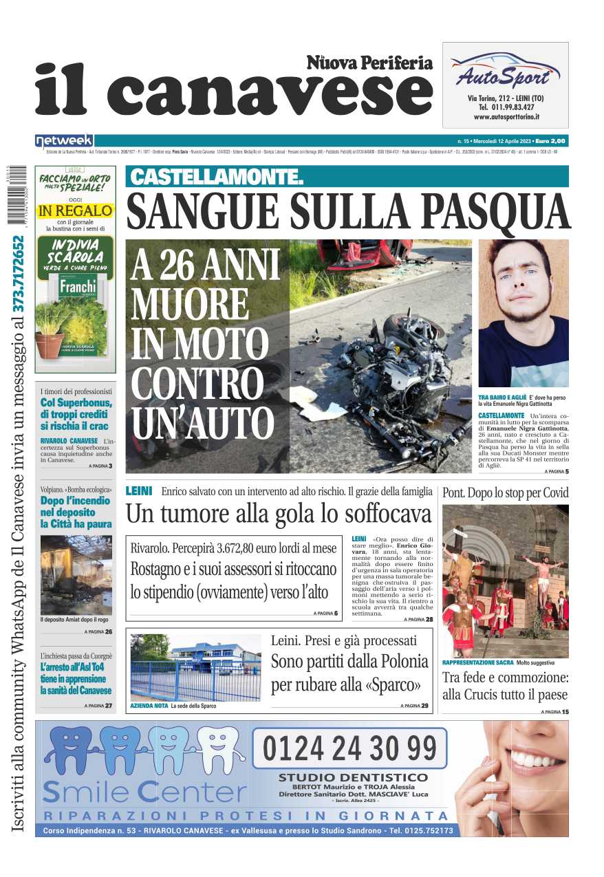 In questa edizione in primo piano il lutto che ha colpito Castellamonte per la scomparsa di Emanuele Nigra, 26enne che il giorno di Pasqua era in sella alla sua Ducati Monster quando ha tragicamente perso la vita in un tragico incidente stradale. Una storia a lieto fine quella di Enrico, 18enne di Leini operato d’urgenza per un tumore che lo stava soffocando. Alla Sparco di Leini tentano il furto dopo essere partiti dalla Polonia: ladri arrestati e già processati.