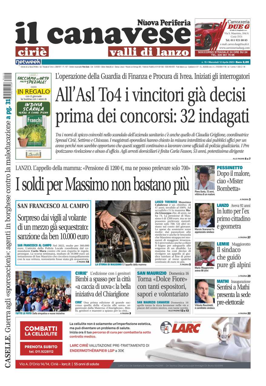 In prima pagina lo scandalo Asl dei concorsi truccati: 32 indagati. A Lanzo lo sfogo della mamma di Massimo, disabile al 110%: “La pensione non basta più: dei 1200 euro posso prelevarne solo 700”. A San Francesco al Campo uomo sorpreso alla guida di un mezzo sequestrato: 10mila euro di multa.