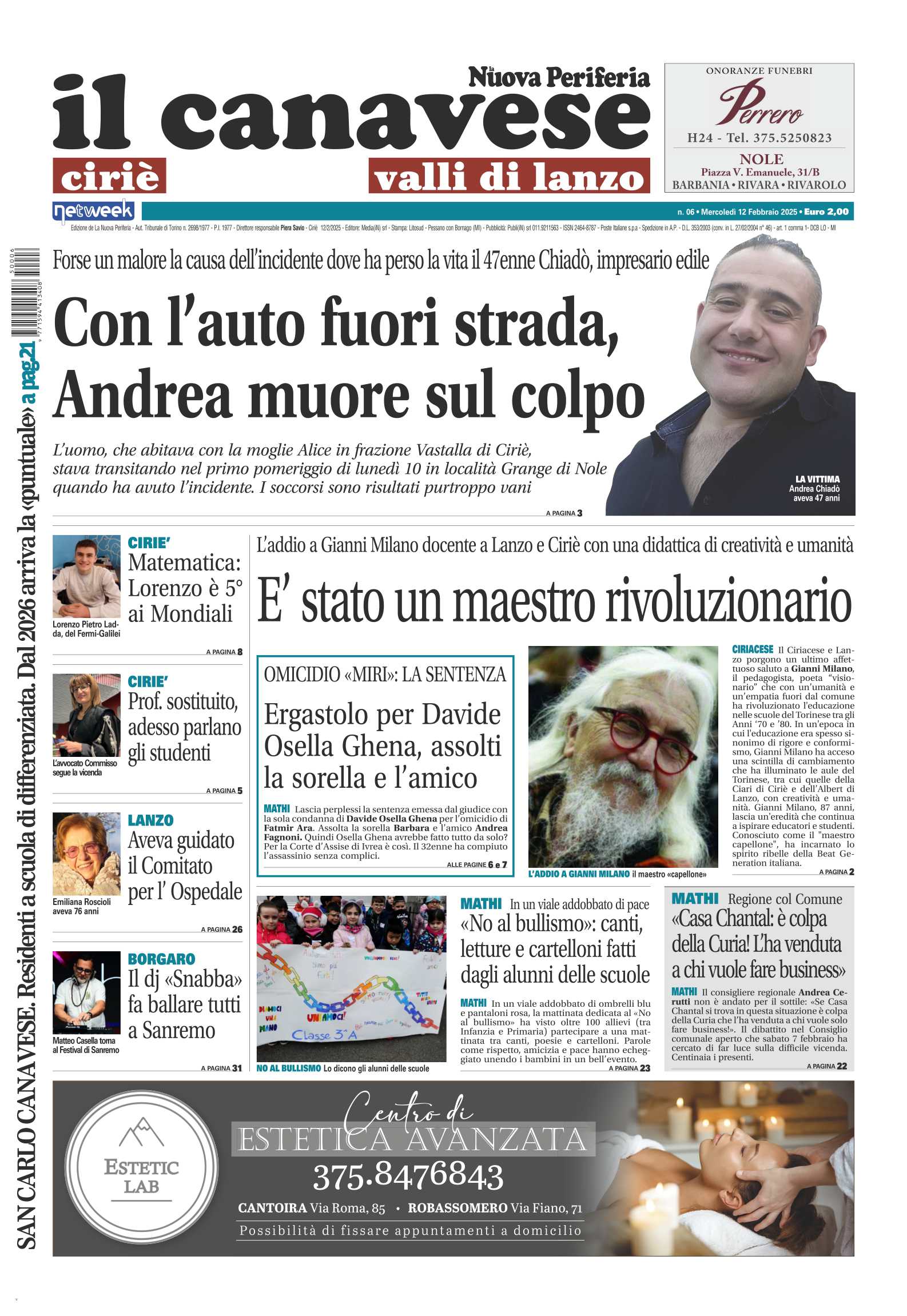 In prima pagina la tragica morte di Andrea Chiadò, 47 anni, vittima di un terribile incidente stradale. Ciriacese in lutto per la scomparsa di Gianni Milano, maestro rivoluzionario docente a Ciriè e Lanzo. Omicidio Miri: ergastolo per Davide Osella Ghena, assolti la sorella e l’amico.