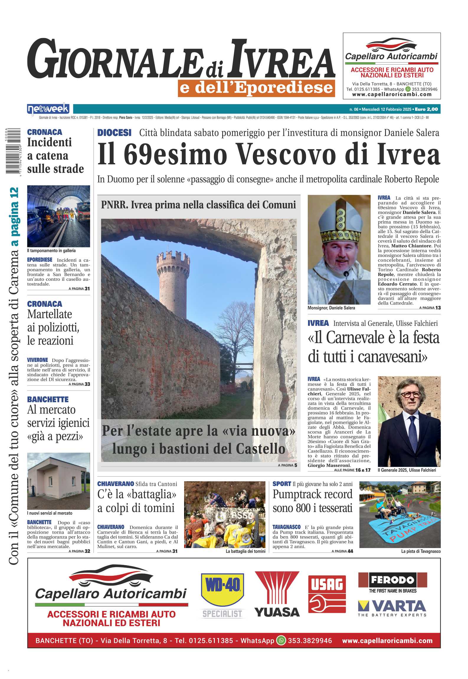 In evidenza il 69esimo vescovo di Ivrea: in Duomo per il solenne passaggio di consegne con Monsignor Cerrato, anche il cardinale Roberto Repole. Pnrr: Ivrea prima nella classifica dei Comuni. E poi la nostra intervista al Generale del Carnevale 2025 Ulisse Falchieri: «Il Carnevale è la festa di tutti i canavesani»