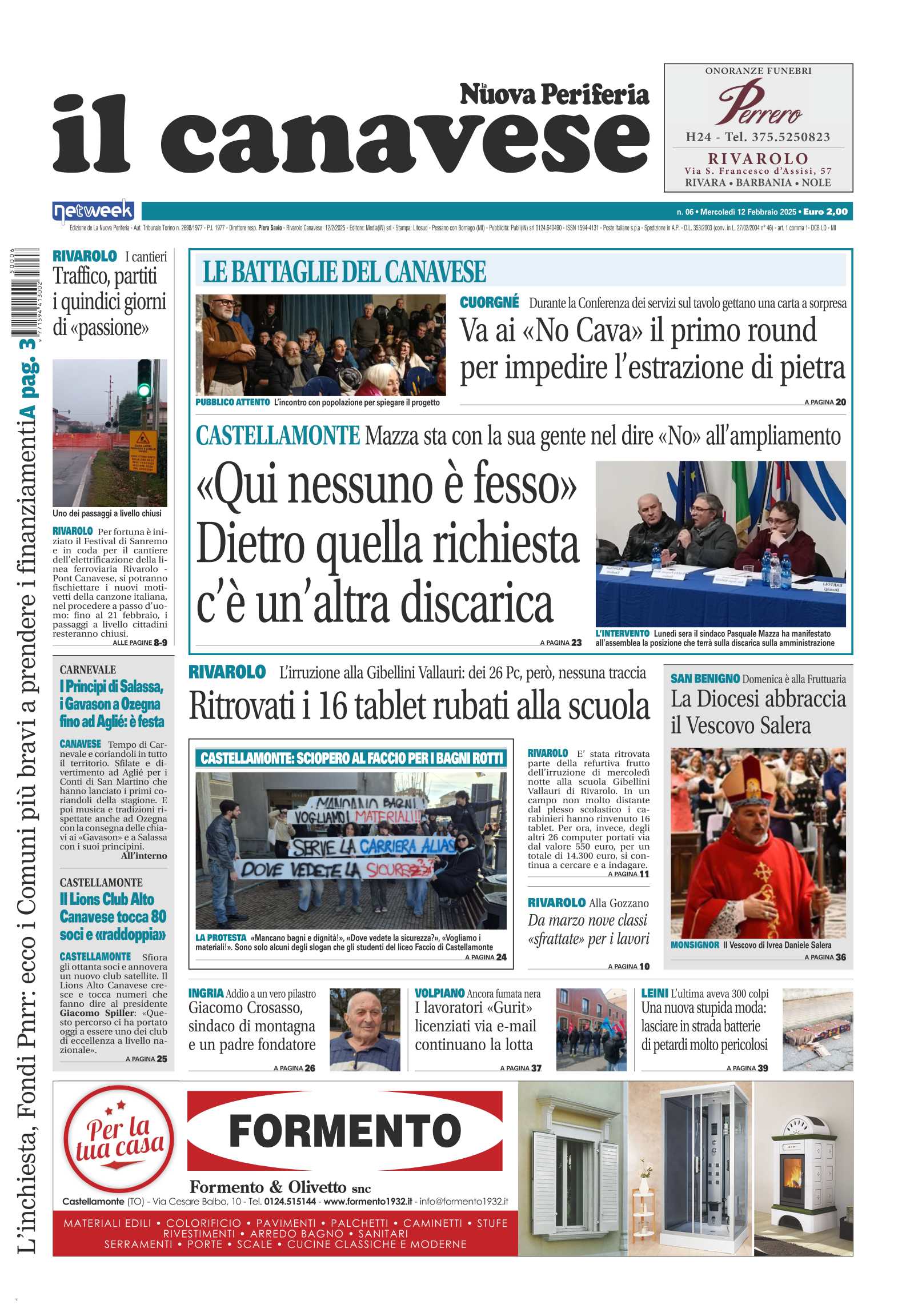 In questa edizione in primo piano il «No» di Castellamonte all’ampliamento della discarica, mentre Cuorgnè si batte per contrastare l’apertura della cava. A Rivarolo furto alla scuola primaria Vallauri ritrovati nei campi 16 tablet. La Diocesi abbraccia il nuovo vescovo Salera.