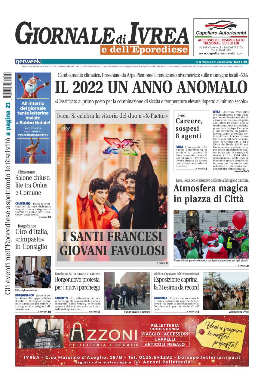 In evidenza la festa a Ivrea per la strepitosa vittoria del duo eporediese Santi Francesi a X-Factor, la città si prepara a celebrare la vittoria dei due bravissimi musicisti. Il cambiamento climatico: il 2022un anno anomalo, classificato al primo posto per la combinazione di siccità e temperature elevate. La bufera che ha coinvolto il carcere di Ivrea con 8agenti sospesi per maltrattamenti ai detenuti.