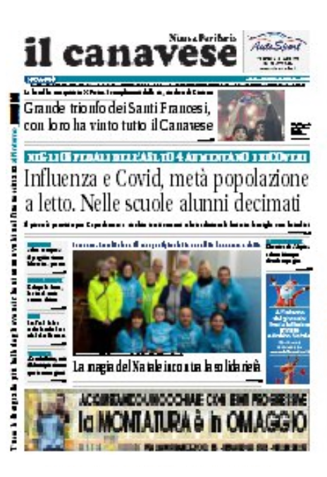In questa edizione in primo piano il grande trionfo dei Santi Francesi a X-Factor 2022, il duo canavesano ha conquistato il pubblico di Sky. L’ondata di influenza costringe a letto metà popolazione: nelle scuole classi decimate ma il picco è previsto per le festività fra Natale e Capodanno con pranzi e cenoni a rischio. La grande solidarietà del Canavese per il piccolo Simone affetto da una rara malattia neurodegenerativa.