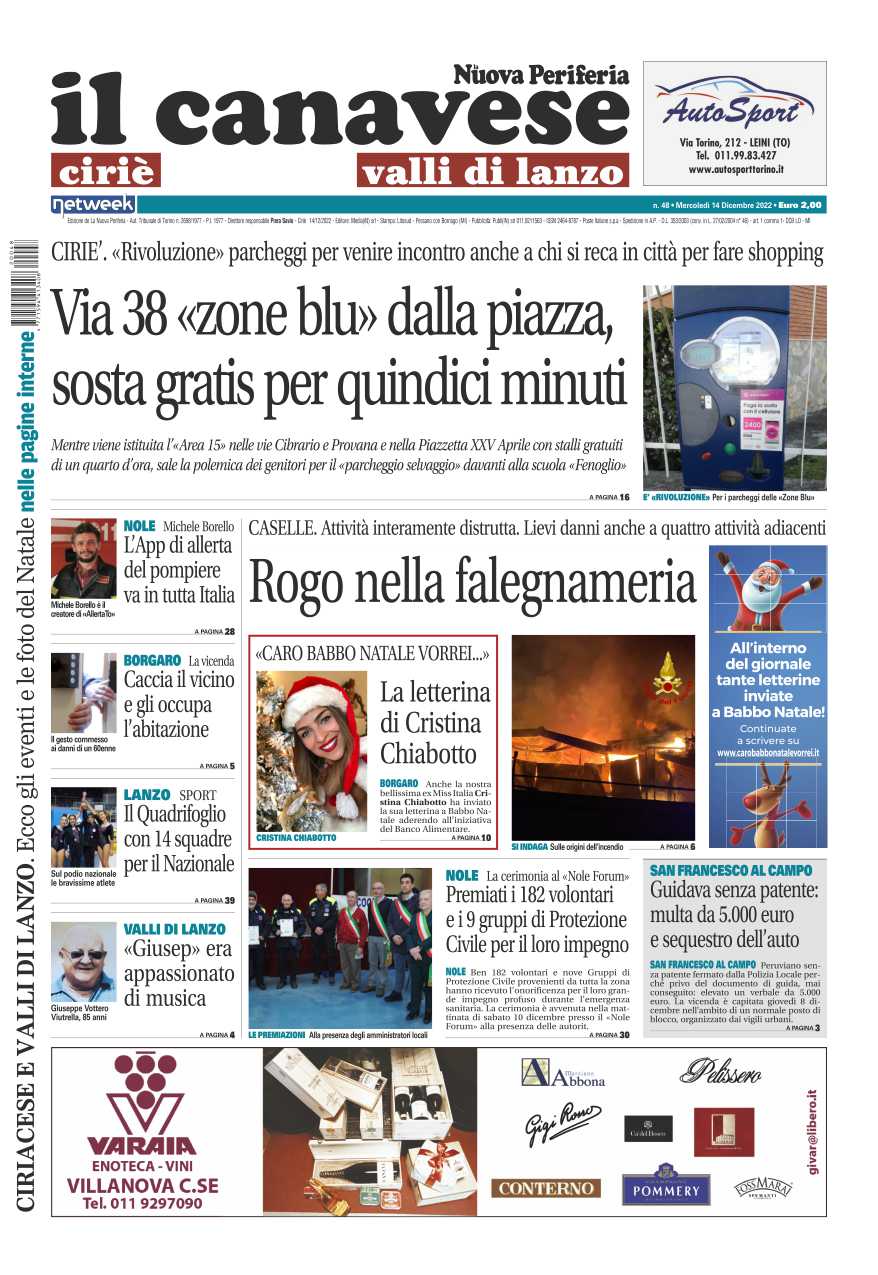In prima pagina a Ciriè rivoluzione parcheggi per venire incontro a chi si reca in città per lo shopping, via 38zone blu dalla piazza: sosta gratis per 15 minuti. A Caselle rogo alla falegnameria, attività interamente distrutta. Per la nostra iniziativa “Caro Babbo Natale vorrei…” la letterina di Cristina Chiabotto.