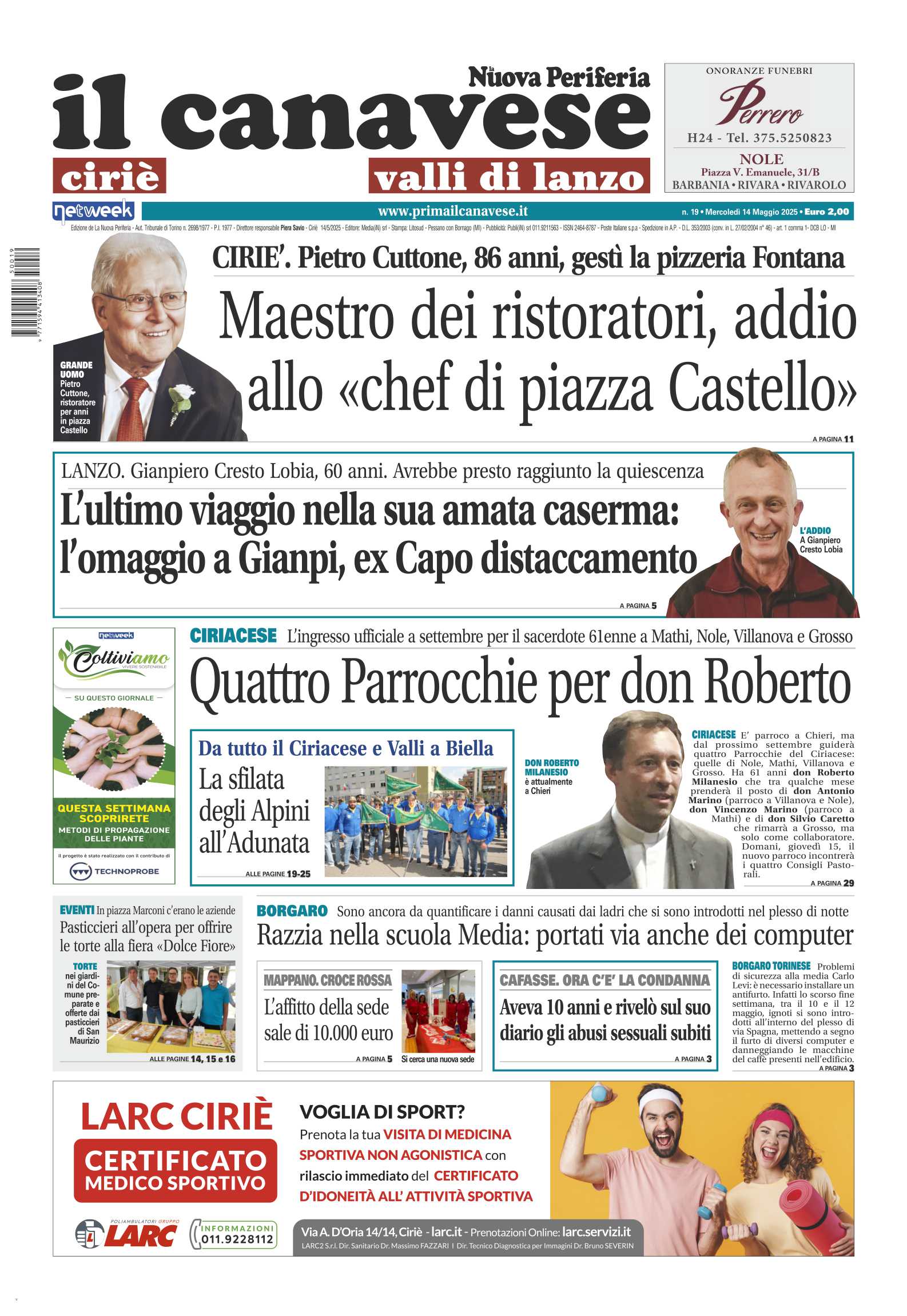 In prima pagina l’addio di Ciriè a Pietro Cuttone, gestì la pizzeria Fontana in piazza Castello. Lutto anche a Lanzo che ha salutato per sempre Gianpiero Cresto Lobia, ex capo distaccamento. Il Ciriacese accoglie Don Roberto, da settembre il parroco, ora a Chieri, guiderà quattro parrocchie.