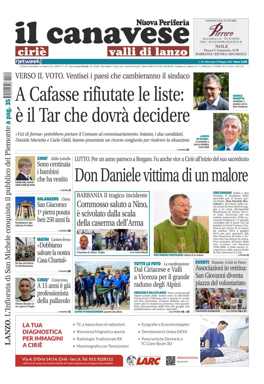 In prima pagina le prossime elezioni amministrative: tutti i nomi e le liste dei candidati al voto nel Ciriacese e nelle Valli. Intanto a Cafasse rifiutate le liste: sarà il Tar a doversi pronunciare. Ciriè e Borgaro dicono addio a Don Daniele, vittima di un malore improvviso. Lutto anche a Barbania che ha salutato per l’ultima volta Nino Broglia, scivolato dalle scale fuori dalla caserma dei carabinieri e morto sul colpo.