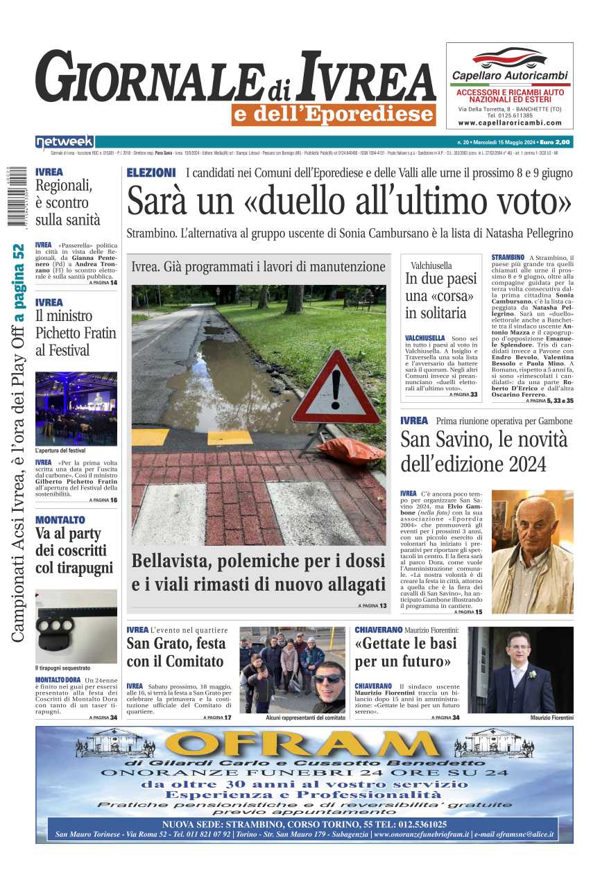 In evidenza le elezioni comunali dell’8 e 9 giugno: sarà una lotta all’ultimo voto, un’analisi di tutti i Comuni al voto. Con le piogge le strade si riempiono di buche: già previsti i lavori di manutenzione ma intanto la polemica si infiamma a Ivrea nel quartiere Bellavista. San Savino, ecco tutte le novità dell’edizione 2024.