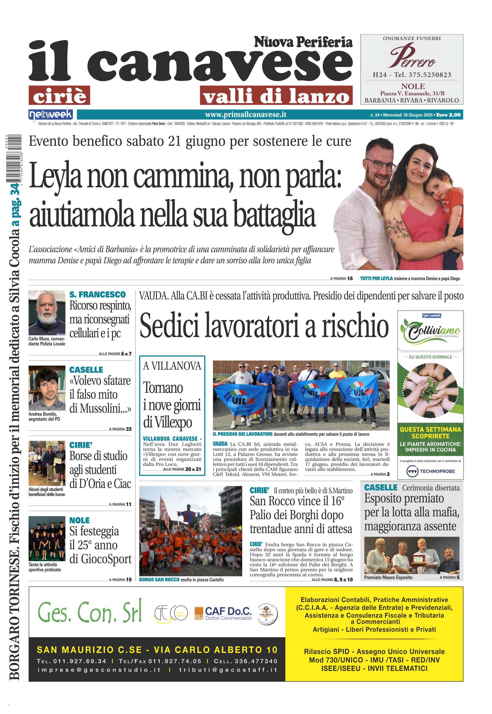 In prima pagina la battaglia della piccola Leyla affetta da una rara malattia: la piccola non cammina e non parla, il 21 giugno un evento benefico per raccogliere fondi e aiutare la famiglia a pagare le cure. Lavoratori Cabi in presidio: a rischio 16 lavoratori dell’azienda di Vauda. San Rocco vince il 16esimo Palio dei Borghi a Ciriè ed è grande festa.