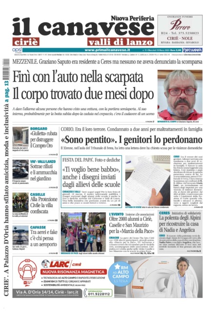 In prima pagina il ritrovamento dell’auto nella scarpata con il corpo senza vita all’interno di Graziano Saputo a due mesi dall’incidente: nessuno ne aveva denunciato la scomparsa anche se non si vedeva in giro da tempo. Dal carcere scrive una lettera, letta in tribunale, ai genitori per chiedere scusa durante il processo per maltrattamenti in famiglia, il 32: “Sono pentito”. La marcia per la Pace degli alunni di Ciriè e San Maurizio.