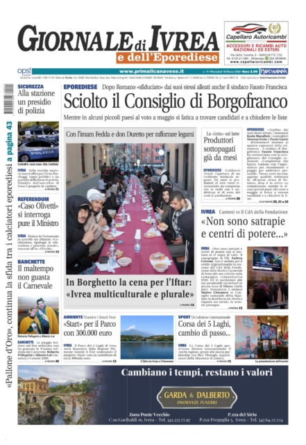 In evidenza le dimissioni in massa del Consiglio comunale di Borgofranco: il sindaco Francisca sfiduciato, accade dopo la vicenda analoga accaduta nei giorni scorsi anche a Romano. In Borghetto a Ivrea la cena multiculturale per l’Iftar con l’Imam Fedda e Don Duretto. La lotta sul latte: produttori sottopagati, Coldiretti chiede l’apertura di un tavolo di confronto sindacale.
