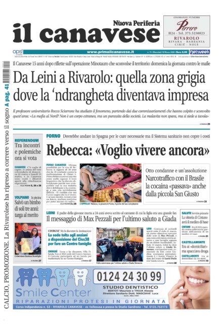 In questa edizione in primo piano l’incontro con il professor Rocco Sciarrone sull’operazione Minotauro: a 15 anni di distanza l’analisi sulla rete ‘ndranghetista sgominata dalle forze dell’ordine e che portò al commissariamento di Leini e Rivarolo. Rebecca, la ventenne di Forno che da 10 anni combatte con la sindrome di Chiari1 adesso ha urgente bisogno di aiuto: serve il trasferimento in Spagna per permetterle le cure urgenti per continuare a vivere. L’ultimo saluto a Giada Simeone, la 24enne di Leini deceduta la scorsa settimana in ospedale a Torino: il messaggio di Max Pezzali che lei amava tanto e le note della sua musica ad accompagnarla per l’ultimo viaggio.