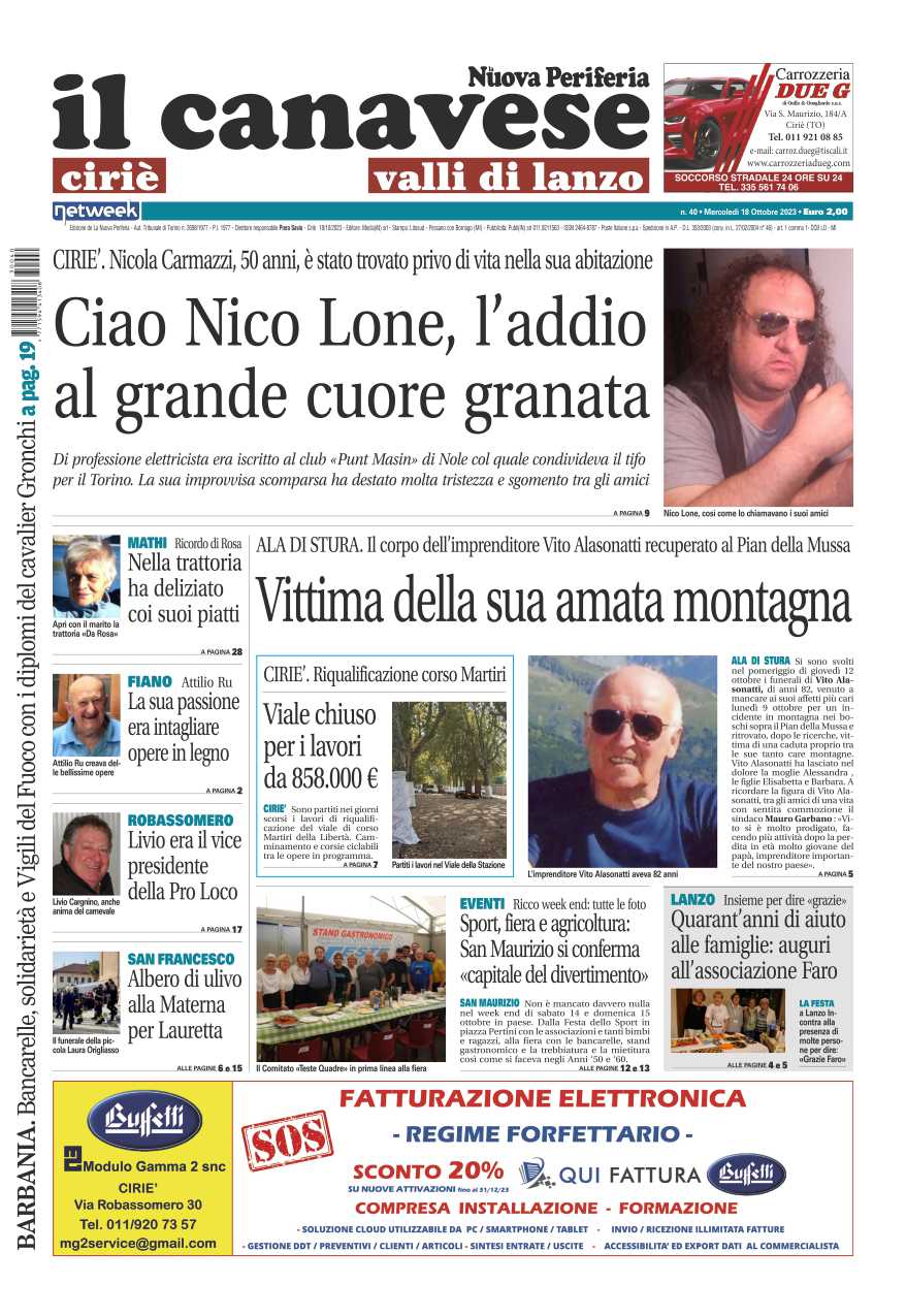 In prima pagina la scomparsa di Nicola “Nico Lone” Carmazzi, trovato senza vita nella sua abitazione, vittima di un malore impreovviso. Ad Ala di Stura è lutto per la morte di Vito Alasonatti, scomparso all’età di 82 anni per un tragico incidente in montagna. A Ciriè la riqualificazione di corso Martiri costerà858mila euro.