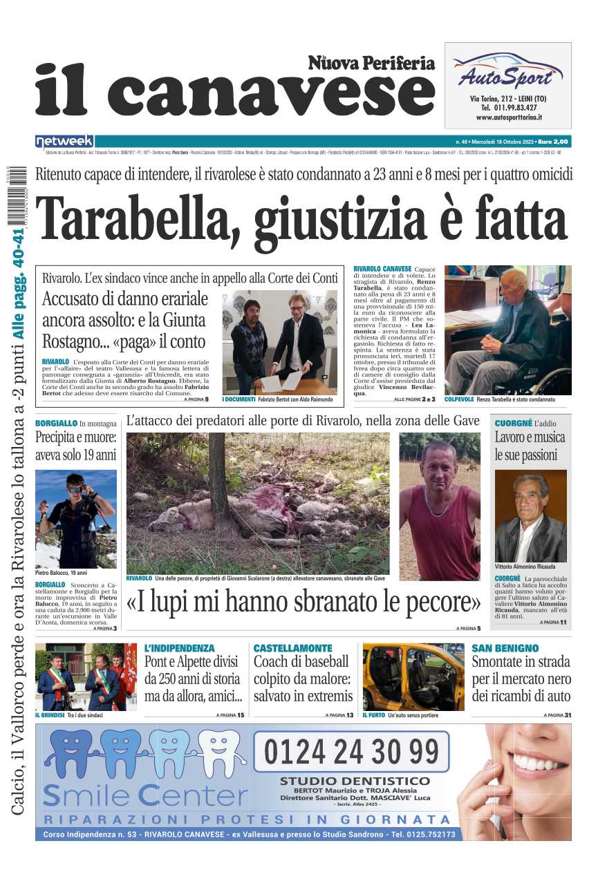 In questa edizione in primo piano la sentenza di condanna a Renzo Tarabella, l’autore della strage di corsoItalia a rivarolo nell’aprile 2021. La tragica morte di Pietro Balocco, 19enne castellamontese che ha perso la vita in un terribile incidente in montagna in Valle d’Aosta. A San Benigno auto smontate in strada per portare via le portiere.