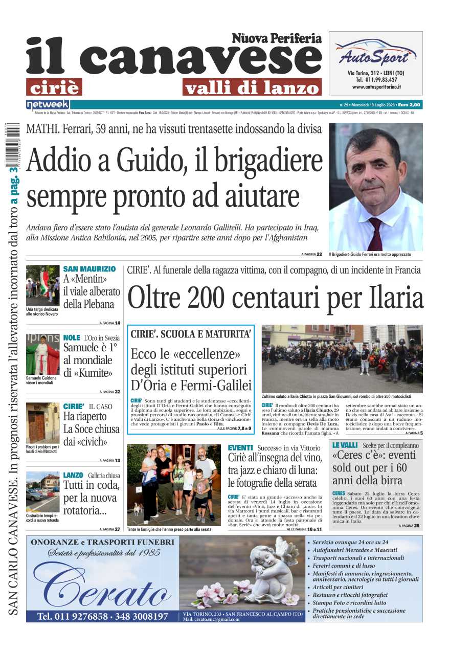 In prima pagina l’addio a Guido, il brigadiere sempre pronto ad aiutare, aveva 59 anni e per 37 ha indossato la divisa. L’ultimo straziante saluto a Ilaria morta in un tragico incidente in moto insieme al suo ragazzo in Savoia. Al “Ceres c’è” tutto sold out per i 60 anni dellastorica birra danese.