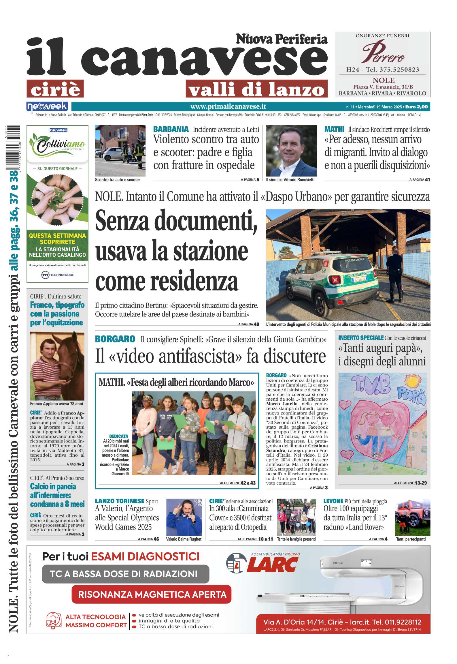 In prima pagina l’allontamento a Nole di un uomo che viveva in stazione, applicato il daspo urbano. A Borgaro bagarre su un video pubblicato sui social dal gruppo “Uniti per cambiare”, il consigliere Spinelli: “Grave il silenzio della Giunta”. A Barbania violento scontro tra auto e scooter: padre e figlia in ospedale con fratture multiple.