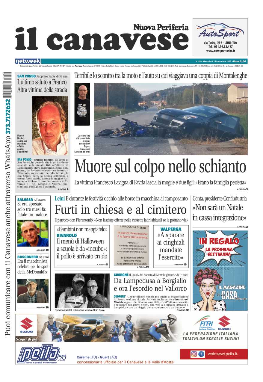 In questa edizione in primo piano il drammatico incidente dove ha perso la vita un motociclista, Francesco Lavigna aveva 56 anni. L’ultimo saluto a Franco Bonino, anche lui vittima di un terribile incidente sulla 460. A Leini furti in chiesa e al cimitero, il parroco: “Non lasciate le offerte nelle cassette, i ladri se le portano via”.