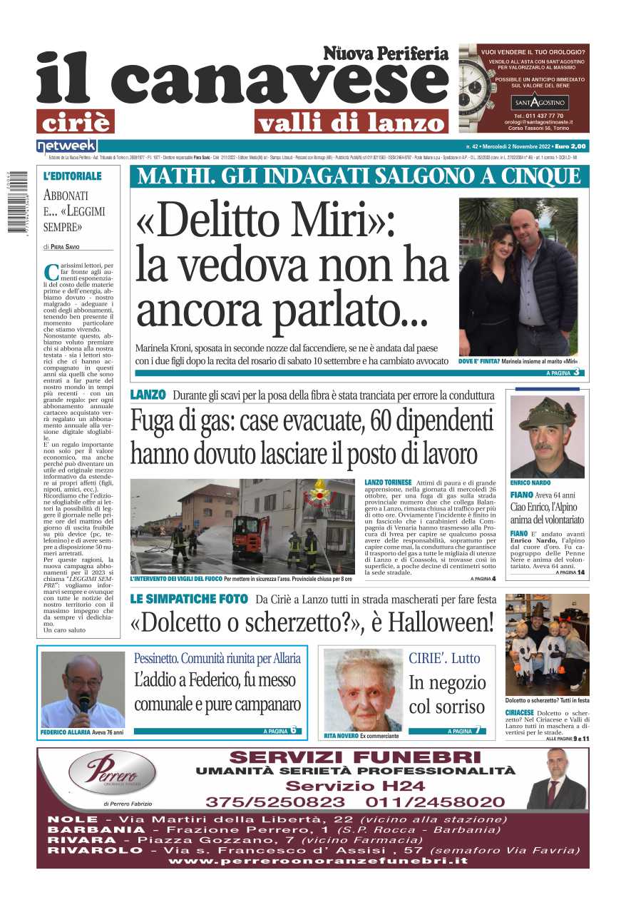 In prima pagina le indagini sul delitto Miri, ora gli indagati salgono a cinque mentre cresce il mistero attorno al silenzio della vedova. Grossa fuga di gas a Lanzo: case evacuate e 60 dipendenti costretti a lasciare il posto di lavoro. A Pessinetto lutto per la scomparsa di Federico Allaria, fu campanaro e messo comunale