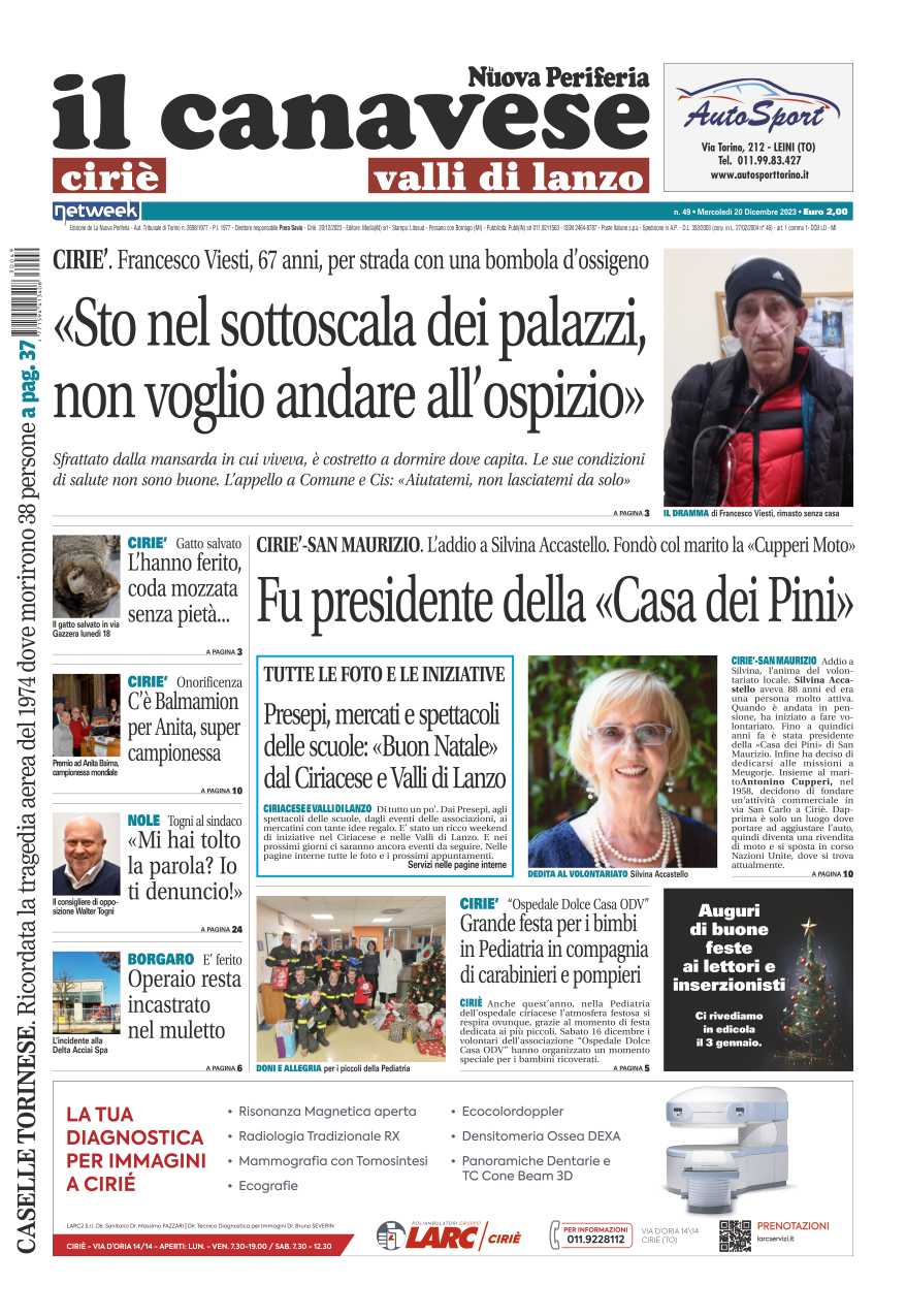 In prima pagina la storia di Francesco: “Sto nel sottoscala dei palazzi, non voglio andare all’ospizio, sfrattato dalla mansarda in cui viveva è costretto a dormire dove capita ma le sue condizioni di salute non sono buone e per vivere ha isogno dell’ossigeno. Ciriè e San Maurizio piangono Silvina Accastello, fu presidente della “Casa dei Pini”. A Ciriè grande festa in pediatria con i carabinieri e i pompieri.