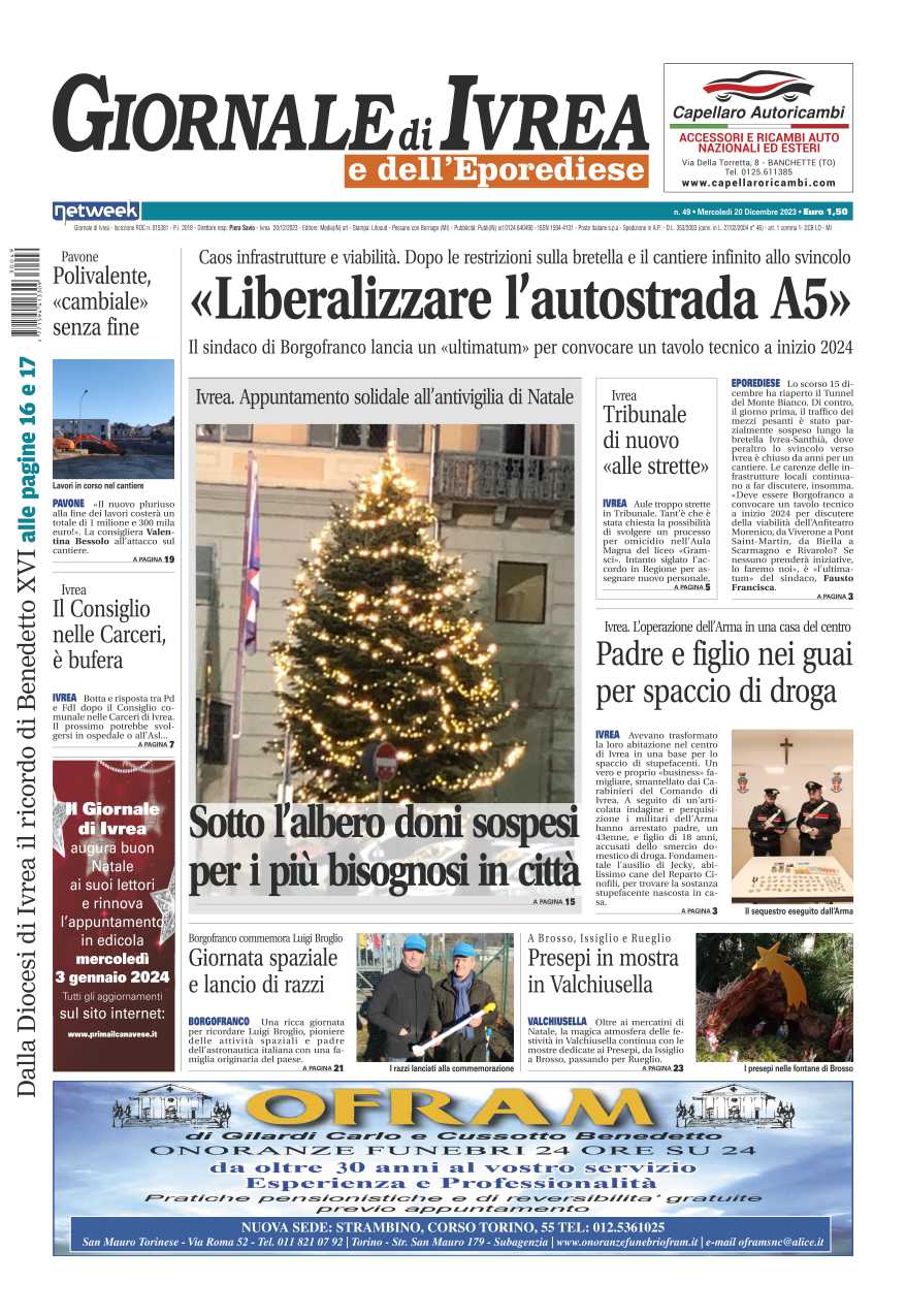 In evidenza il caos sulle strade dopo le restrizioni sulla bretella e il cantiere infinito allo svincolo il sindaco di Borgofranco lancia un ultimatum per convocare un tavolo tecnico a inizio 2024 e chiede di liberalizzare l’autostrada A5. A Ivrea sotto l’albero i regali sospesi, l’appuntamento solidale dell’antivigilia. A Ivrea padre e figlio nei guai per spaccio di droga.