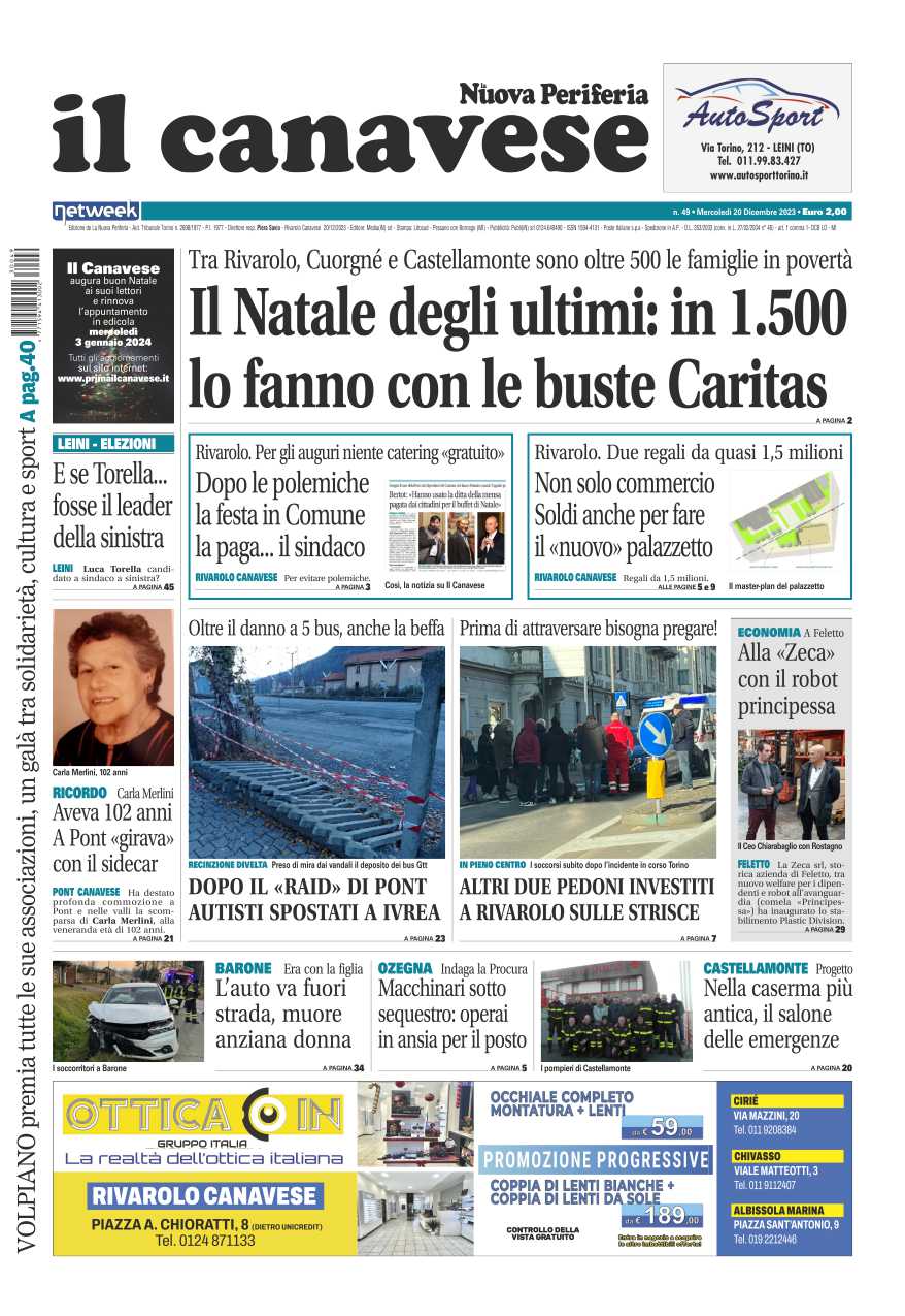 In questa edizione in primo piano il Natale degli ultimi: sono in crescita le famiglie che si rivolgono alla Caritas e grazie alle buste prepareranno il pranzo del 25. Dopo le polemiche dello scorso anno, quest’anno la cena di auguri dei dipendenti comunali a Rivarolo la paga il sindaco. In una ditta di Ozegna macchinari sotto sequestro, indaga la Procura, operai in ansia.