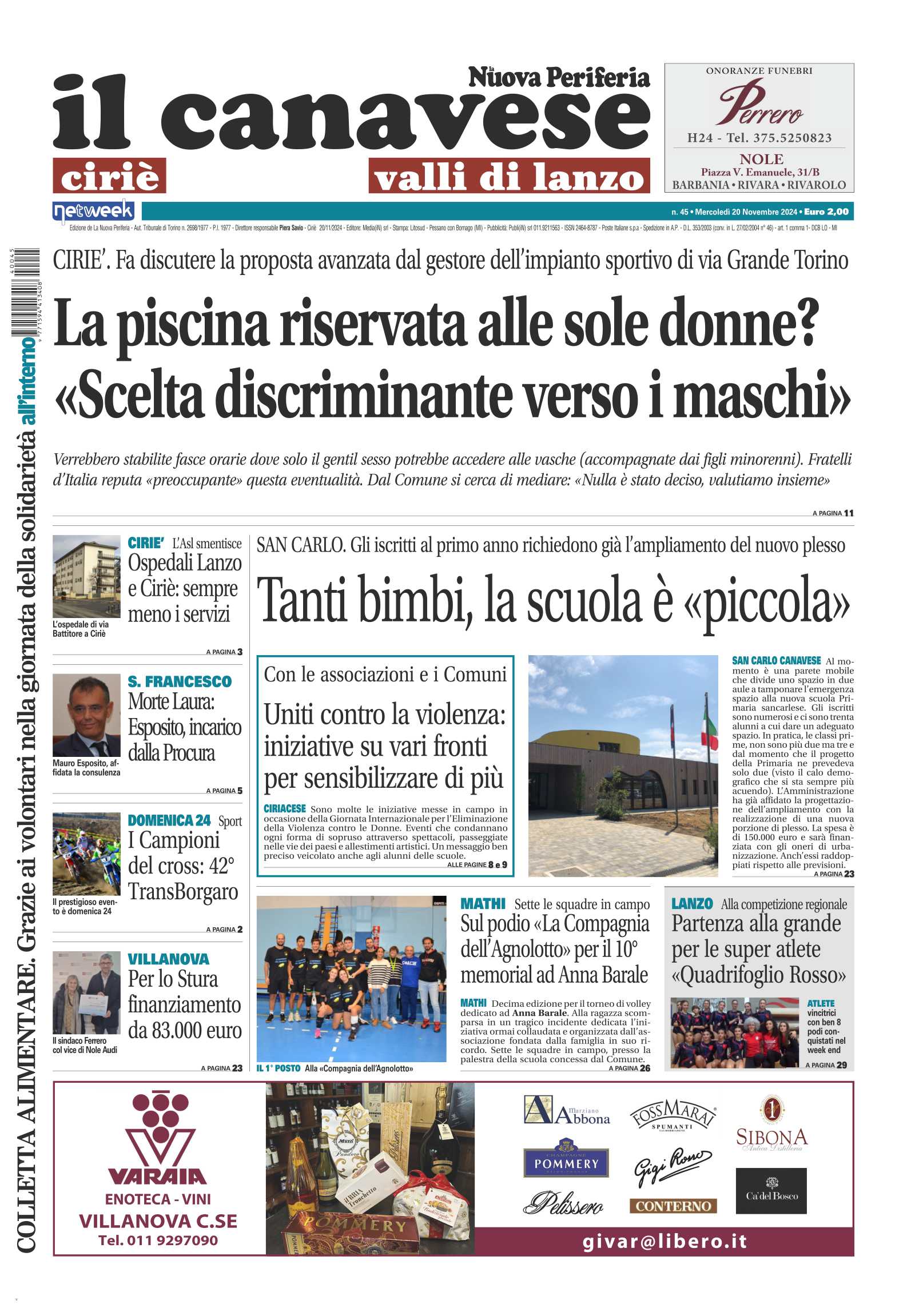 In prima pagina il caso della scuola di San Carlo: la scuola è  troppo piccola per i bimbi iscritti, sarà necessario un ampliamento della struttura. A Ciriè è polemica per la proposta del gestore della piscina: riservarla alle sole donne? Discriminatorio nei confronti degli uomini. Uniti contro la violenza: tante le iniziative nella Giornata contro la violenza sulle donne.