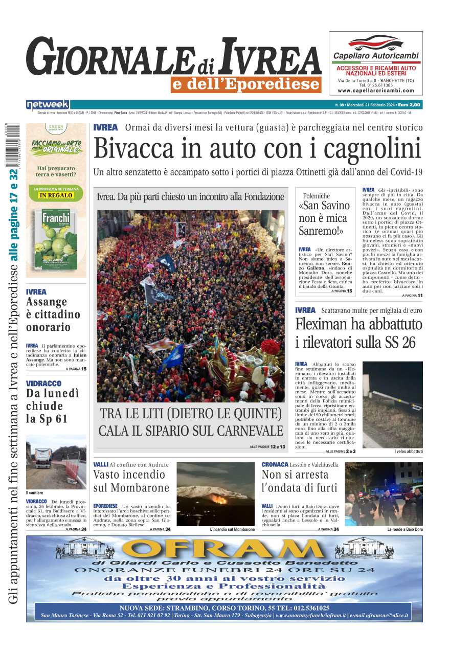 In evidenza “gli ultimi” di Ivrea: ormai da diversi mesi un uomo vive insieme ai suoi cagnolini nella sua auto (guasta) parcheggiata nel centro storico; un altro dal 2020 è accampato sotto i portici di piazza Ottinetti. Tra le liti (dietro le quinte) cala il sipario sul Canevale di Ivrea. Fleximan ha abbattuto il velox sulla SS26.