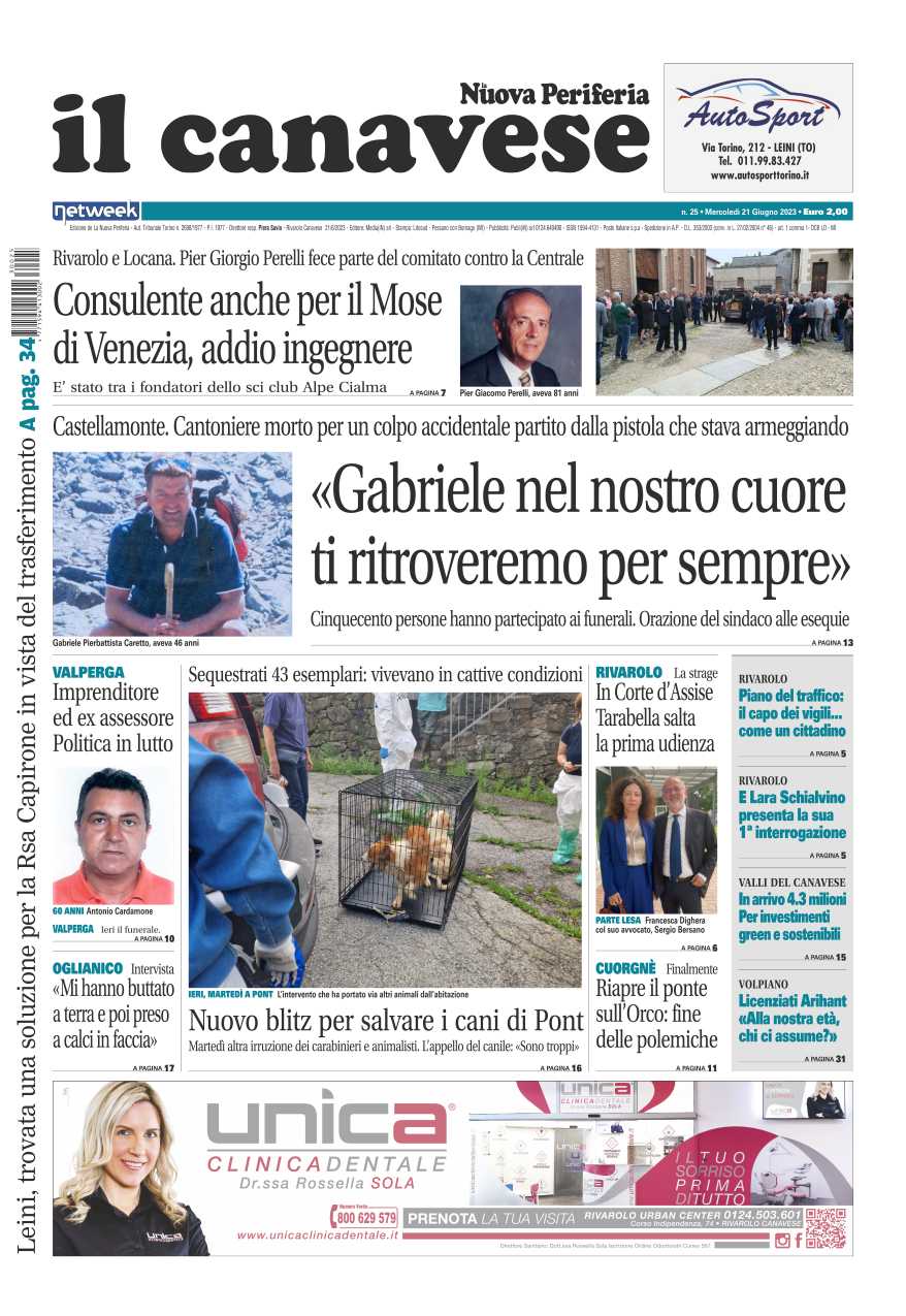 In questa edizione in primo piano l’ultimo saluto a Gabriele, il cantoniere castellamontese scomparso improvvisamente la scorsa settimana per un colpo accidentale partito dalla pistola che stava armeggiando. Rivarolo e Locan piangono l’ingegner Pier Giorgio Perelli, fu anche consulente per il Mose di Venezia. A Pont altro Blitz nell’abitazione di un uomo come già avvenuto nelle scorse settimane (e diverse altre volte negli ultimi 30 anni): sequestrati altri 43 animali.