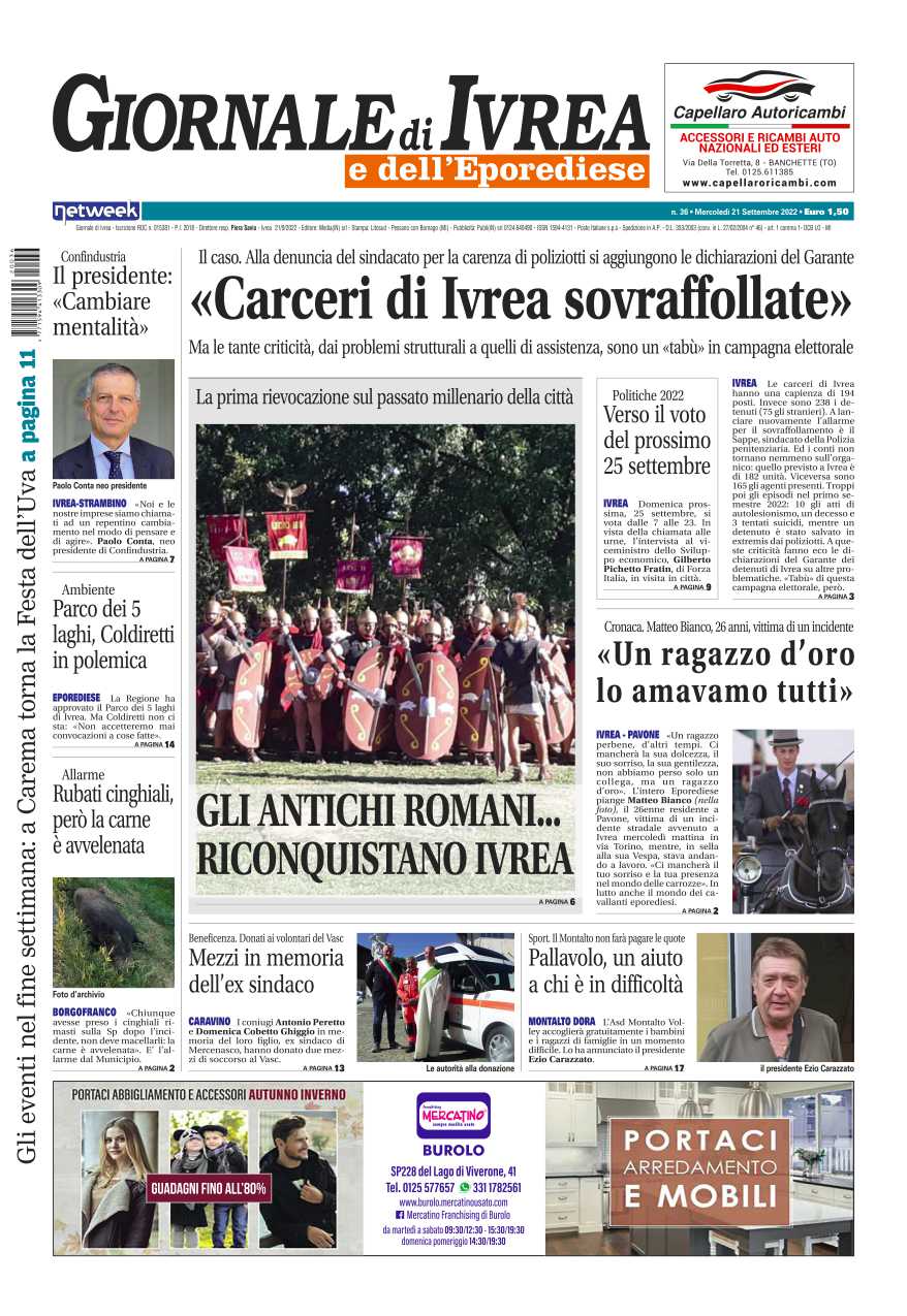 In evidenza il grande problema del carcere eporediese sovraffollato. Gli antichi romani hanno riconquistato Ivrea: un successo la rievocazione storica. L’addio a Matteo Bianco, 26enne rimasto coinvolto in un tragico incidente stradale giovedì scorso in sella alla sua Vespa.