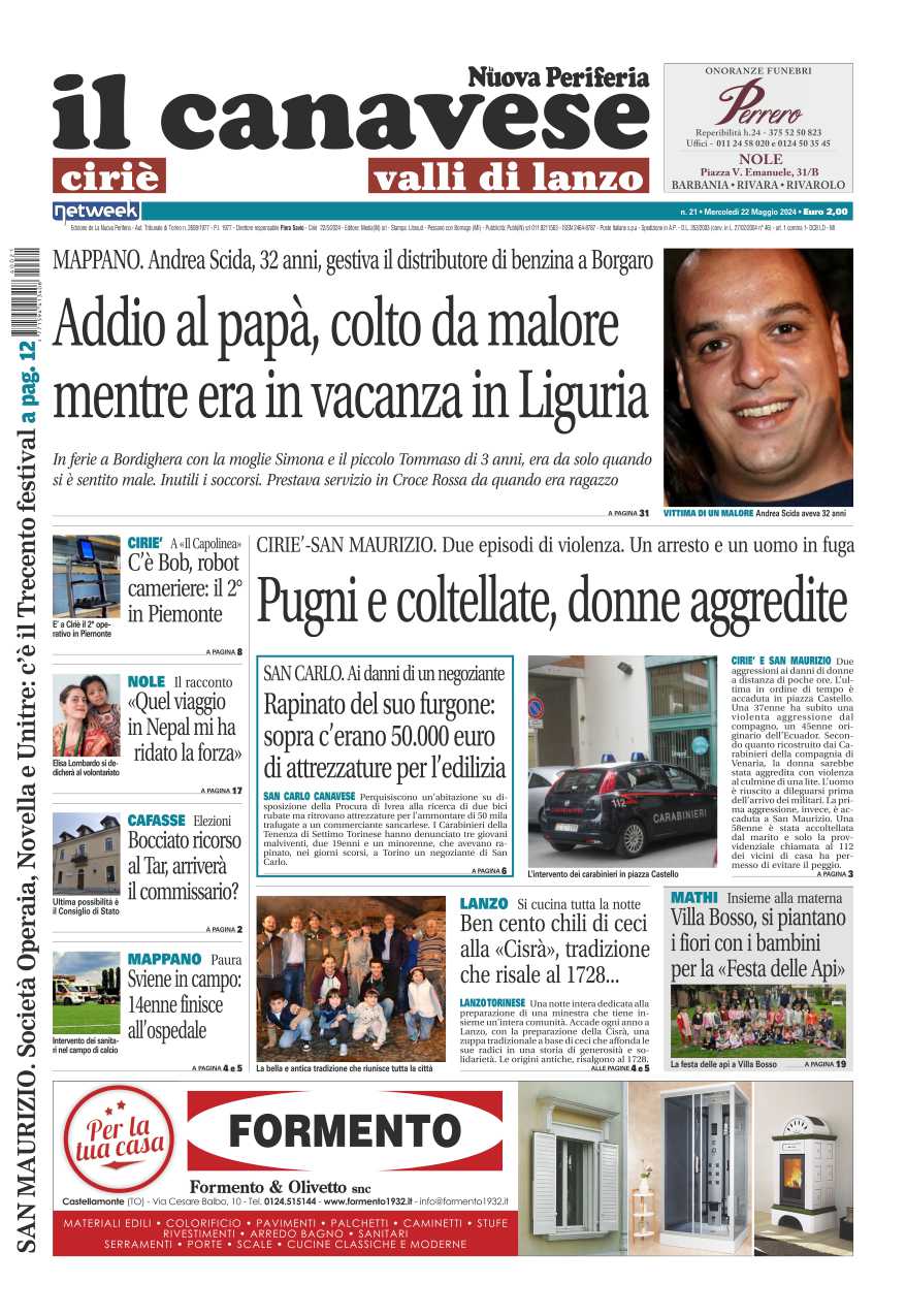 In prima pagina la morte improvvisa di Andrea Scida, 32enne papà vittima di un malore mentre era in vacanza in Liguria con la sua famiglia. Le due aggressioni a due donne e Ciriè e San Maurizio compiute dai loro compagni: pugni e coltellate, sono in prognosi riservata. A San Carlo negoziante derubato del suo furgone: sopra c’erano 50mila di attrezzatura per l’edilizia.