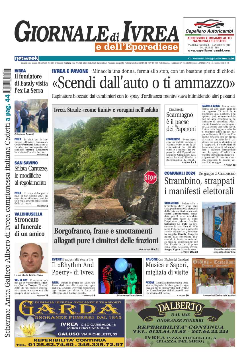 In evidenza il bruttissimo episodio avvenuto fra Ivrea e Pavone dove un uomo ha aggredito una donna minacciandola con un bastone chiodato e poi ha terrorizzato i passanti. La frana di Borgofranco, il maltempo ha causato diversi danni in paese. A Strambino strappati i manifesti elettorali della sindaca uscente Sonia Cambursano.