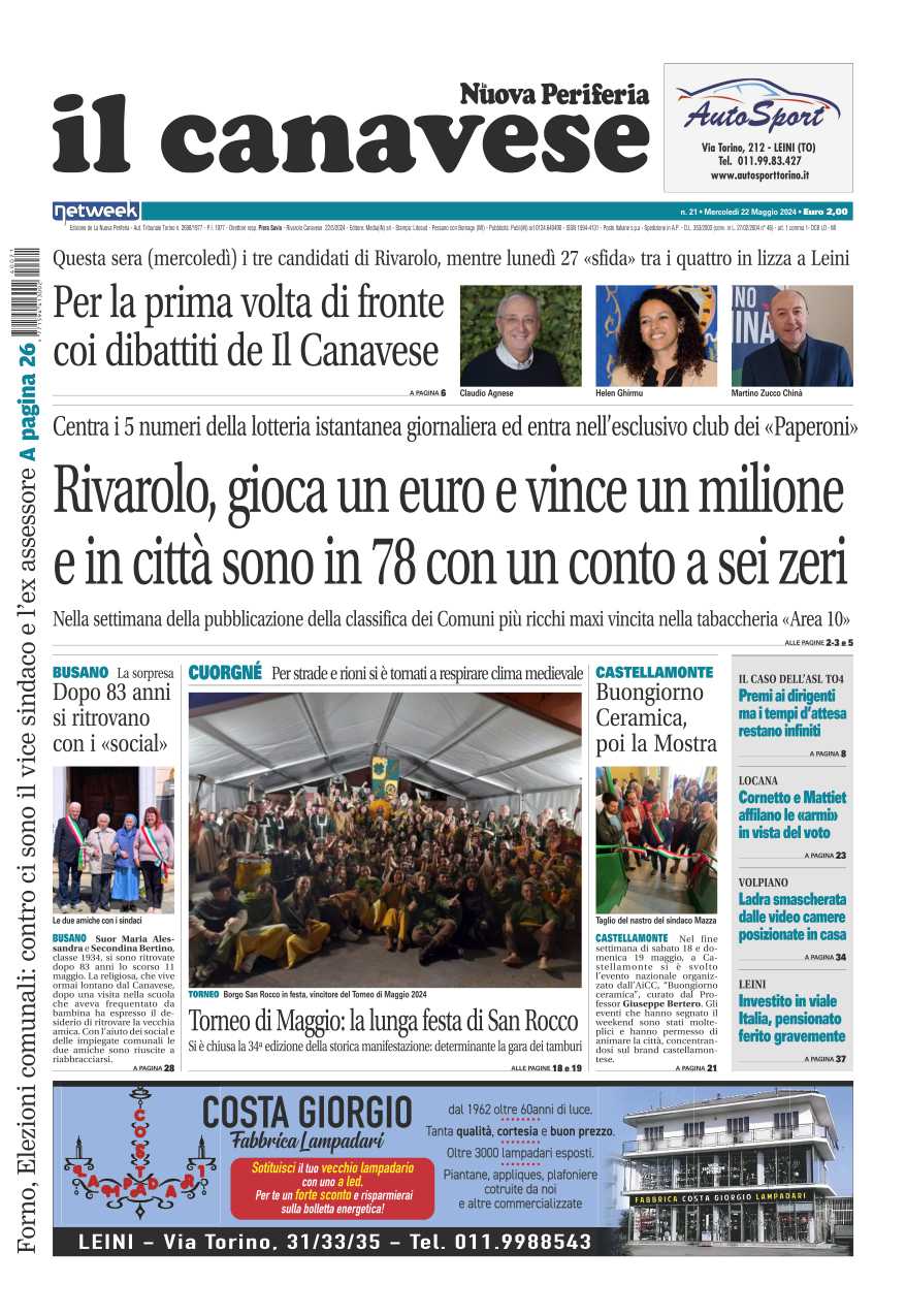 In questa edizione in primo piano la classifica dei “paperoni” del Canavese, e da qualche giorno a Rivarolo ce n’è uno in più grazie alla vincita da un milione alla lotteria giornaliera di un giocatore. Due settimane di festa a Cuorgnè con il Torneo di Maggio, quest’anno a vincere è Borgo San Rocco. Domani sera, mercoledì 22 maggio, a Rivarolo il confronto fra i candidati alla fascia di sindaco promosso dal nostro giornale.