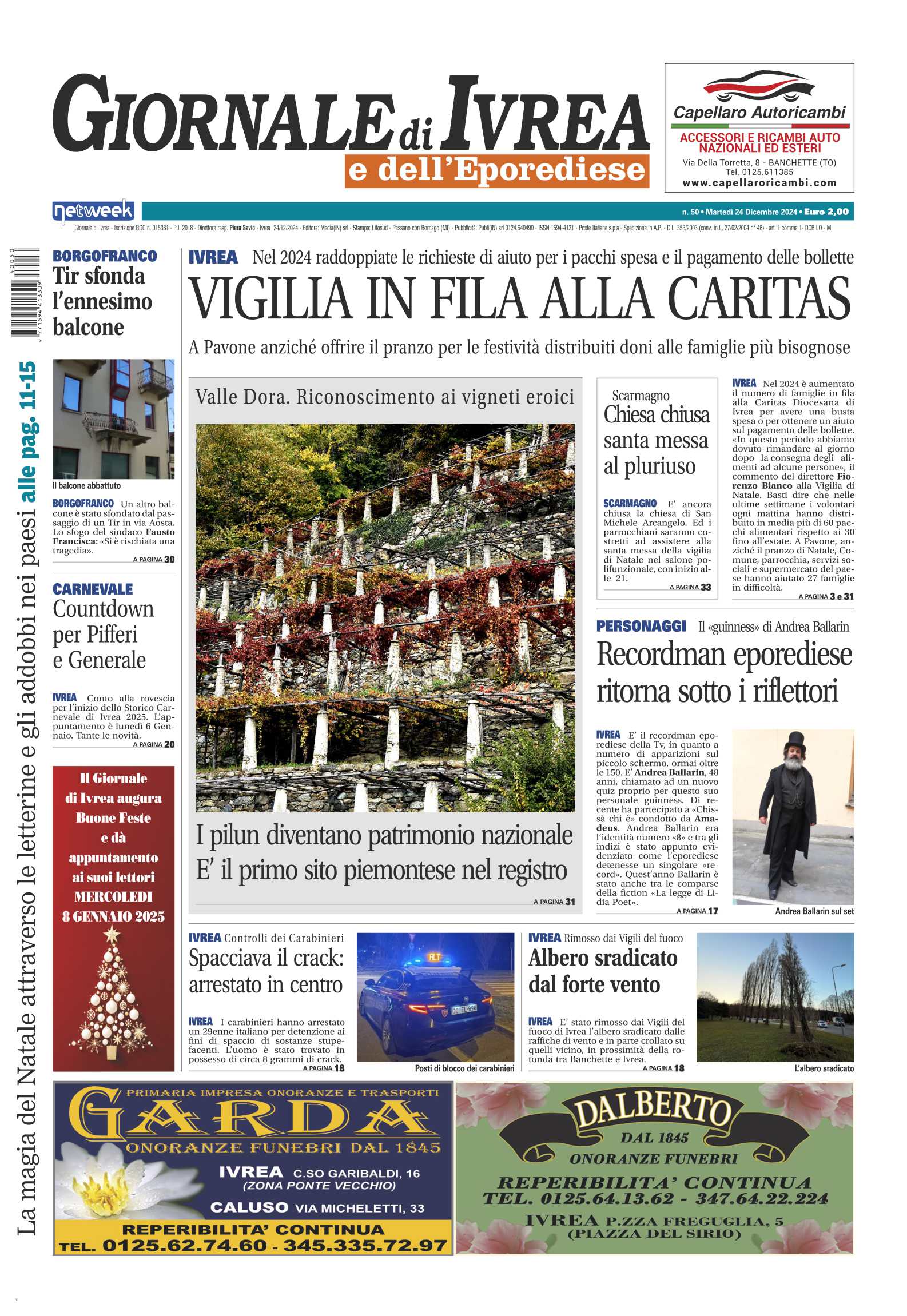 In evidenza la situazione di grave difficoltà di molte famiglie: in fila alla Caritas per mettere qualcosa in tavola nei giorni di festa. A Borgofranco un tir ha sfondato l’ennesimo balcone, il sindaco Francisca torna a chiedere la realizzazione della circonvallazione: «Si è sfiorata la tragedia». Valle Dora, i pilun diventano patrimonio nazionale, i vigneti sono il primo sito piemontese ad ottenere il riconoscimento.E poi ancora tante, tante altre notizie per restare sempre aggiornati su quello che accade sul territorio.