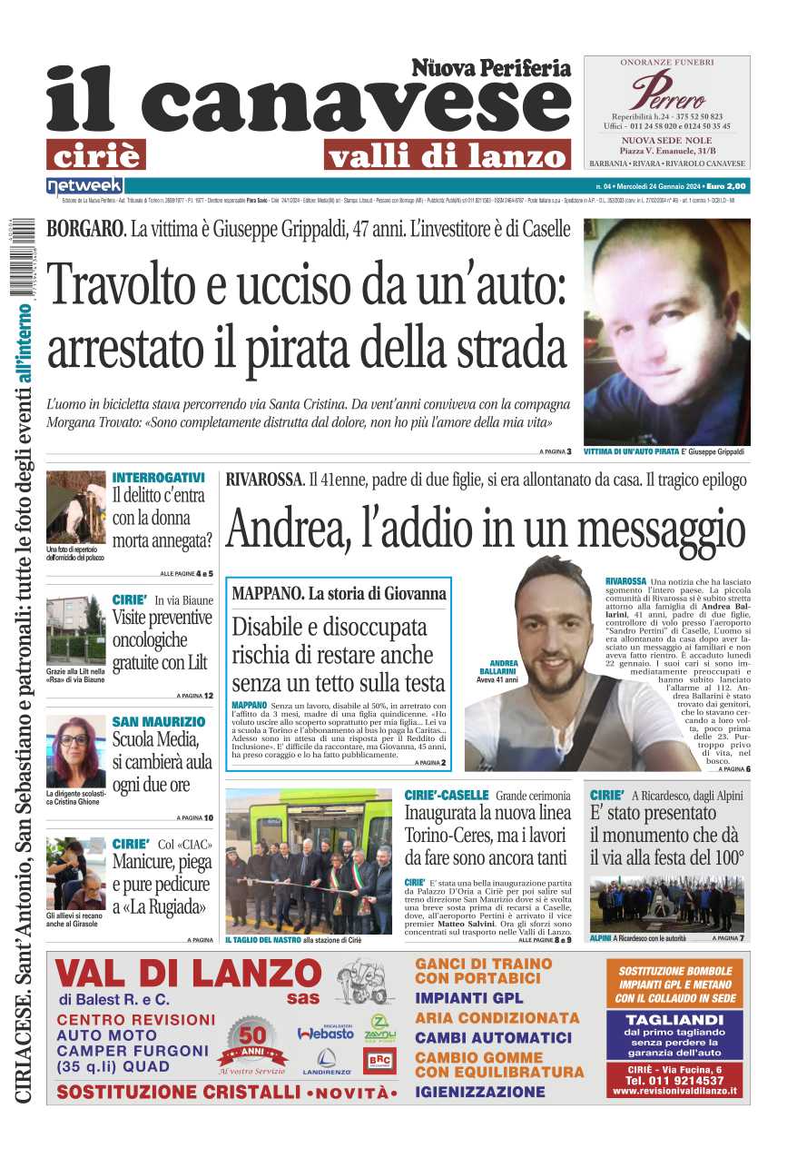 In prima pagina la tragedia di Andrea Ballardini a Rivarossa, ritrovato senza vita nel bosco: i suoi perchè in un messaggio. A Borgaro ciclista travolto e ucciso da un’auto pirata, l’automobilista è stato rintracciato e arrestato poche ore dopo.