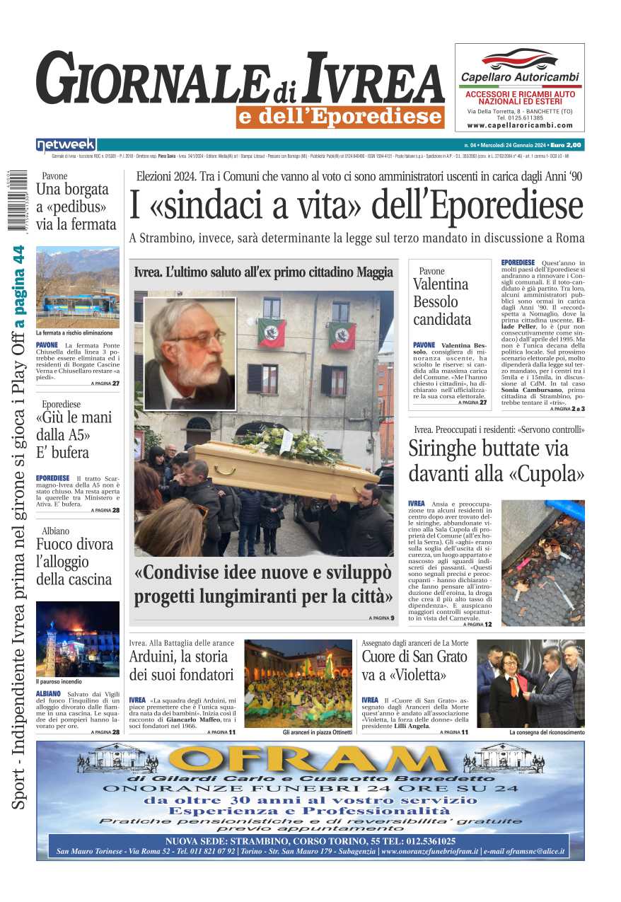 In evidenza la scomparsa dell’ex sindaco di Ivrea Maggia, una folla gremita per l’ultimo saluto a chi ha dato tanto per la sua città. Tutti i sindaci “a vita” dell’Eporediese, dal Governo una legge per aumentare (o togliere) il limite dei mandati. Degrado a Ivrea, siringe abbandonate a terra nei pressi della Sala Cupola.