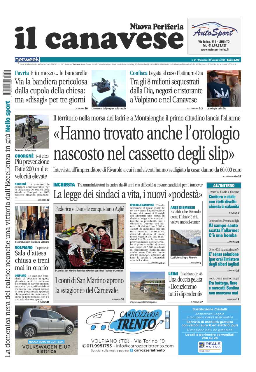 In questa edizione in primo piano il furto con scasso nella villa dell’imprenditore rivarolese: portati via beni per 60mila euro. Cambiamenti in vista per l’elezione dei sindaci, ma soprattutto per i loro mandati: dai tre mandati all’eliminazione del limite. A Volpiano è caos in stazione: sala d’attesa chiusa e treni in ritardo.Il Canavese – edizione Ciriè e Valli di Lanzo